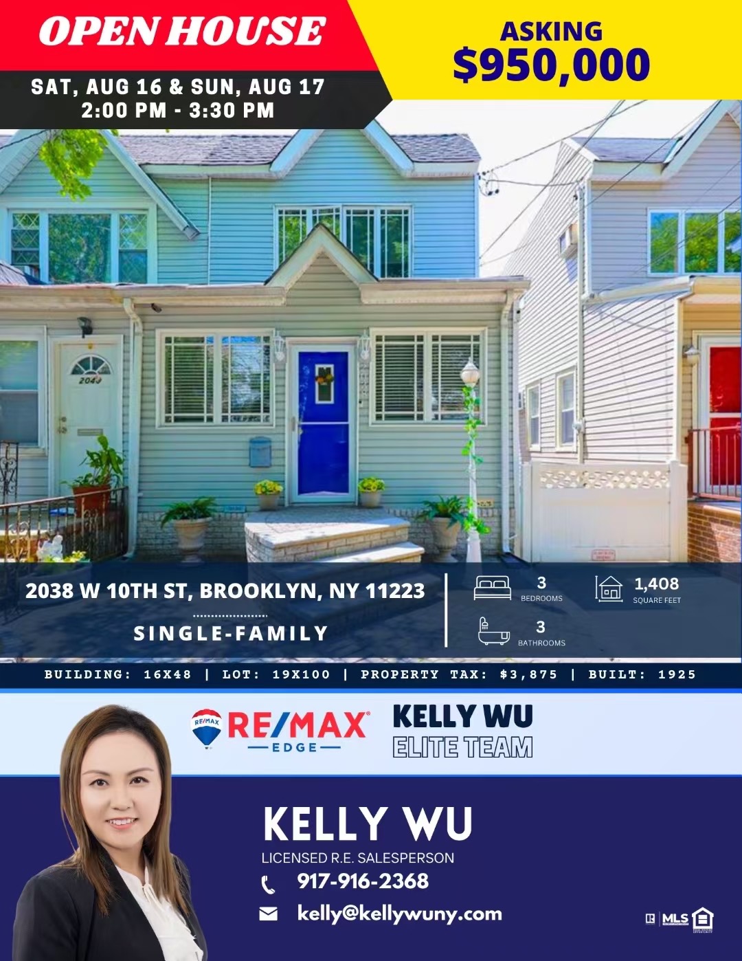 布鲁克林✅西10 街T 和U大道之间单边1家庭3房2.5浴出售✅两层➕完成独立门口半土库🔥新上市:2038 West 10 St, Brooklyn✅1楼:16x48,特大客厅,饭厅,厨房,半浴