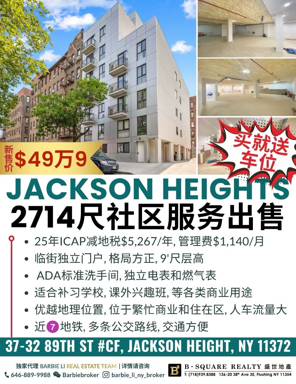 💥JACKSON HEIGHTS 2714尺皇后区社区服务出售 !!!包车位!!!💥