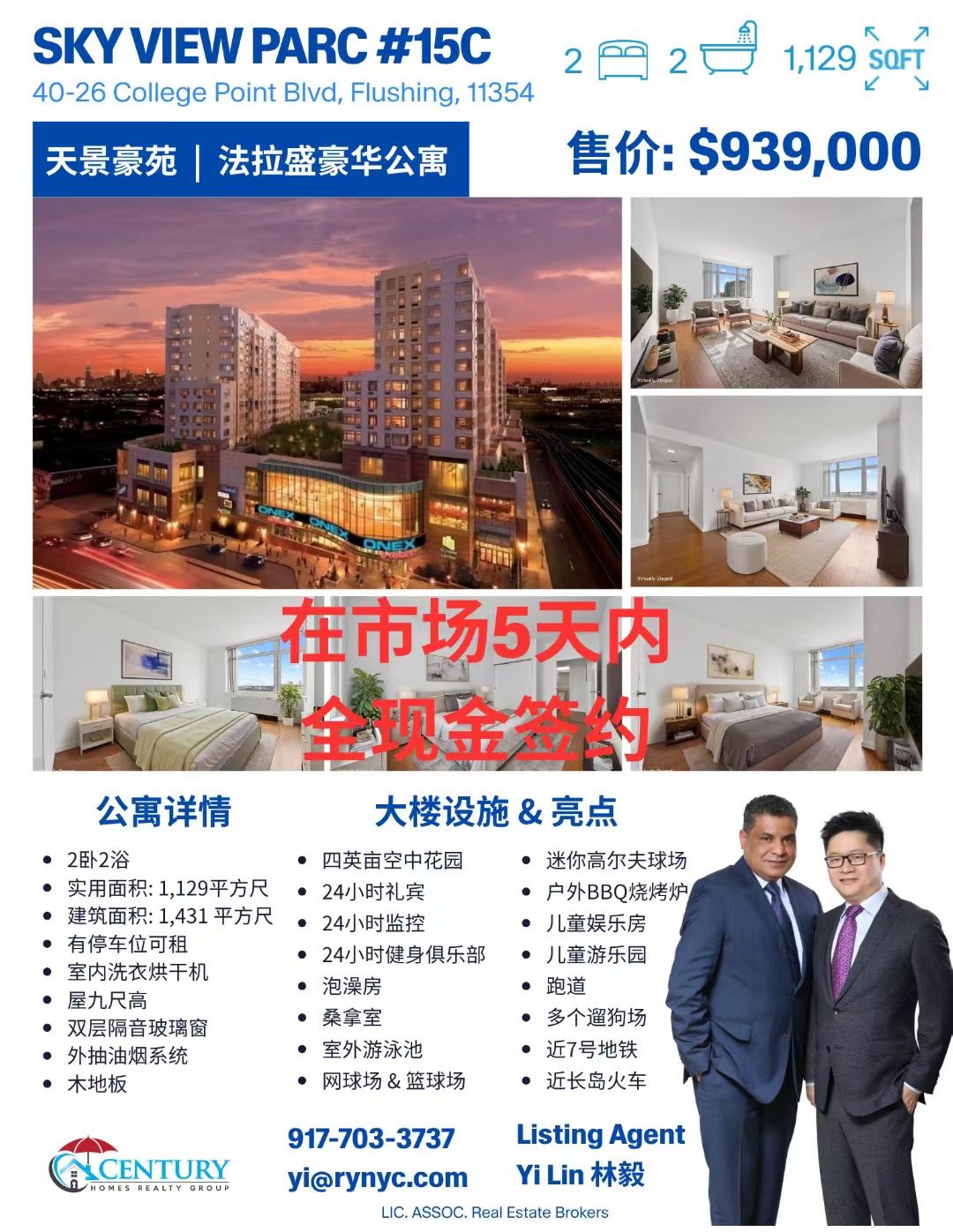 纽约房产市场竞争激烈,选择一位经验丰富的地产经纪与可靠的地产公司尤为关键。纽约华人网365合作的专业地产经纪团队,长期活跃在皇后区、法拉盛、曼哈顿、布鲁克林等热门区域,深谙华人买卖房产需求。我们不仅提供最新楼盘与二手房源信息,更在谈判、贷款、律师对接及过户环节全程陪伴,确保交易安全高效。近期,我们协助客户在纽约天景豪苑成功完成全现金购房并顺利过户,再次展现专业团队的实力与信誉。无论是自住购房还是投资房产,我们都能为您打造最省心的置业体验。🏙【Sky View Parc-天景豪苑 成交】