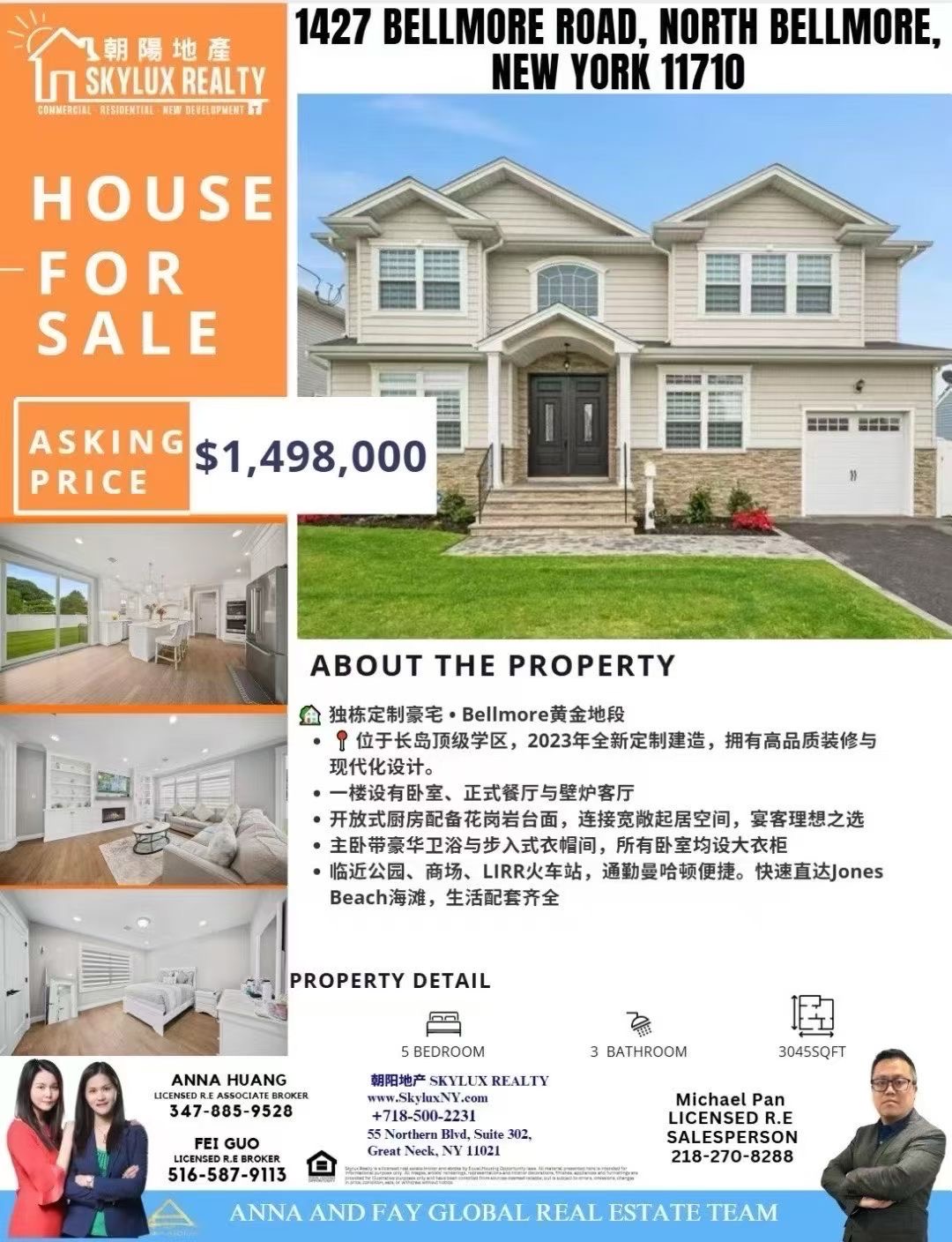 长岛新上市 2023年定制建造殖民地 风格住宅,售$149.8萬坐落于North Bellmore黄金地段,隶属于长岛顶级学区! 这是一套精美设计的定制住宅,拥有5间卧室、3间全浴室,地6000 总居住面积达3,045平方英尺,地税低