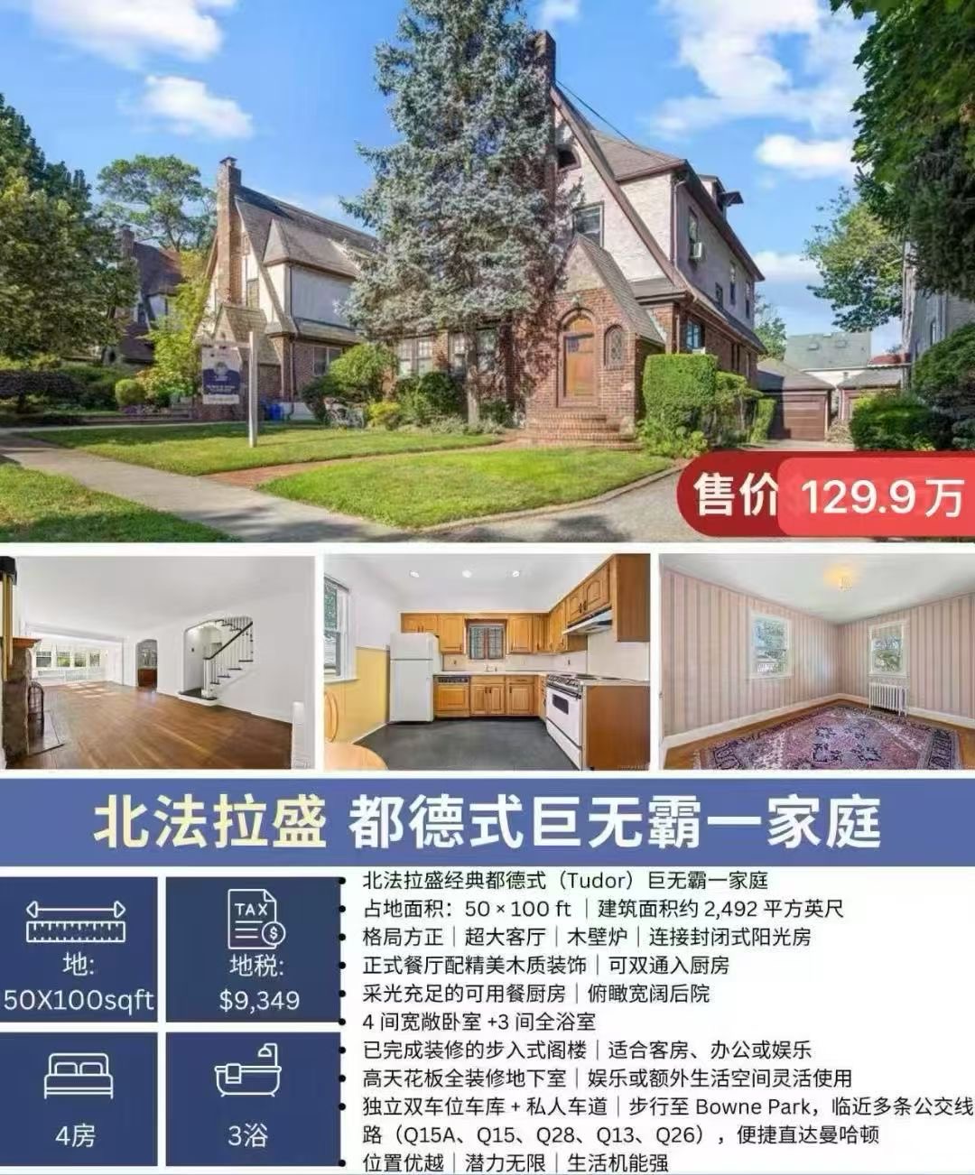 🌈🏰 北法拉盛 · 经典Tudor巨无霸家一庭出售 📍32大道167th St,Flushing,NY 11358✨ 50×100 尺地大 · 建约 2,492 尺🛋 超大客厅 + 壁木炉 + 阳光房🍽 正餐式厅 · 通双厨房 · 宽阔后院