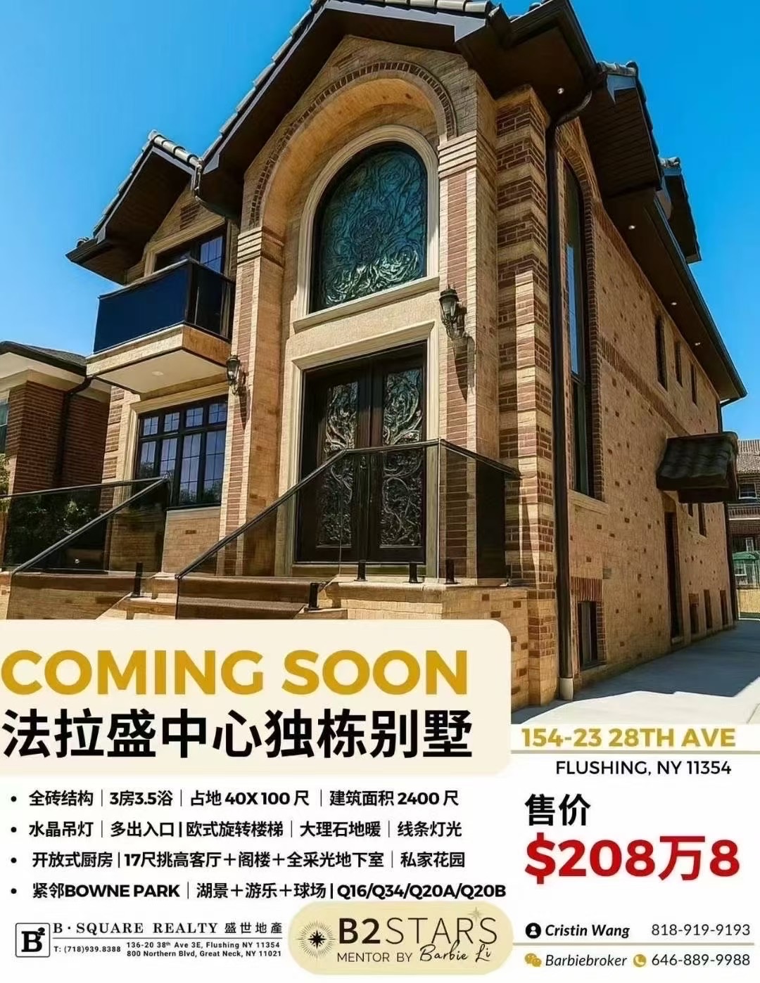 Bowne Park旁北法拉盛全新一家庭火热上市!🎈本周六OpenHouse🎈🏡【法拉盛中心独栋别墅🔥稀有上市】🍱 3房3.5浴 | 占地面积40x100 尺 | 建筑面积2400尺✨ 全砖结构|挑高客厅17尺|水晶吊灯超气派🎯 一家庭独立屋|主层套房|高挑空|欧式旋转楼梯💎 大理石地暖|墙面&天花定制线条灯光🍽 开放式厨房+大理石中岛|配置齐全🌳 前后阳台+私家花园|多出入口🛏 共3房4浴+多窗阁楼+全采光地下室🧺 洗衣房、炉房齐全|地下室高、明亮、可独立使用|超大超高阁楼❄ 高级中央冷暖空调系统|即买即住🏞 门口就是Bowne Park|喷泉湖景+儿童游乐+球场🚌 多线公交Q16/Q34/Q20A/Q20B|生活便利|宁静社区📈 投资 or 自住双赢|核心地段潜力无限💰 售价208万8📍154-23 28th Ave, Flushing, NY 11354