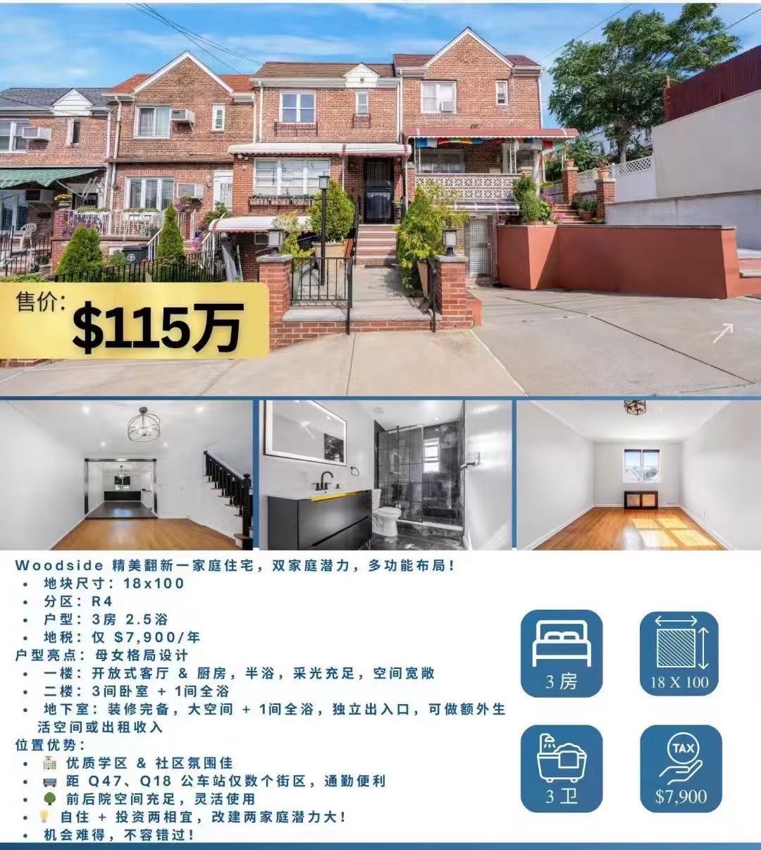 皇后区房子出售Woodside漂亮一家庭出售,地面三层,全新装修,母女屋设计占地18*100,Zoning R4(可合法改2家庭)这套房子内外全部翻新,屋顶4年新,设施全新,拎包入住!母女屋格局,分层独立出入口,私密又方便。4间卧室 + 2.5浴室,空间充裕一楼:开放厨房、餐厅,大客厅、半浴,前后阳光房可直通后院;二楼:3房+豪华浴室;地下室:Walk in,独立出入,一房一厅,直通后院周边配套齐全,交通便利,近多条地铁和巴士Q47/Q18,生活机能一应俱全。💰 低地税$7,900💵 售价:$115万欢迎买家预约📲347-913-6868