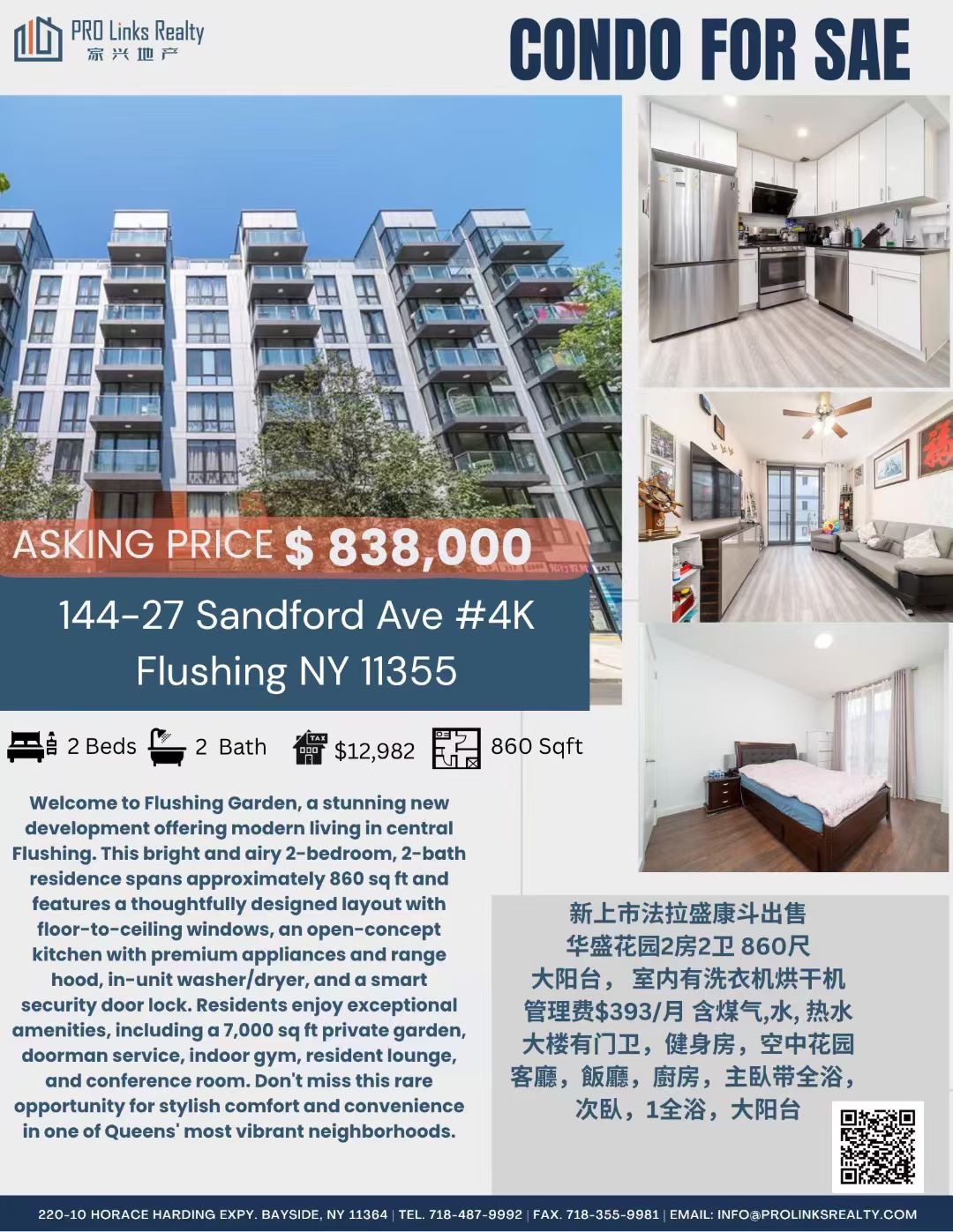🎉新上市法拉盛康斗出售华盛花园2房2卫 860尺🧧售$83万8