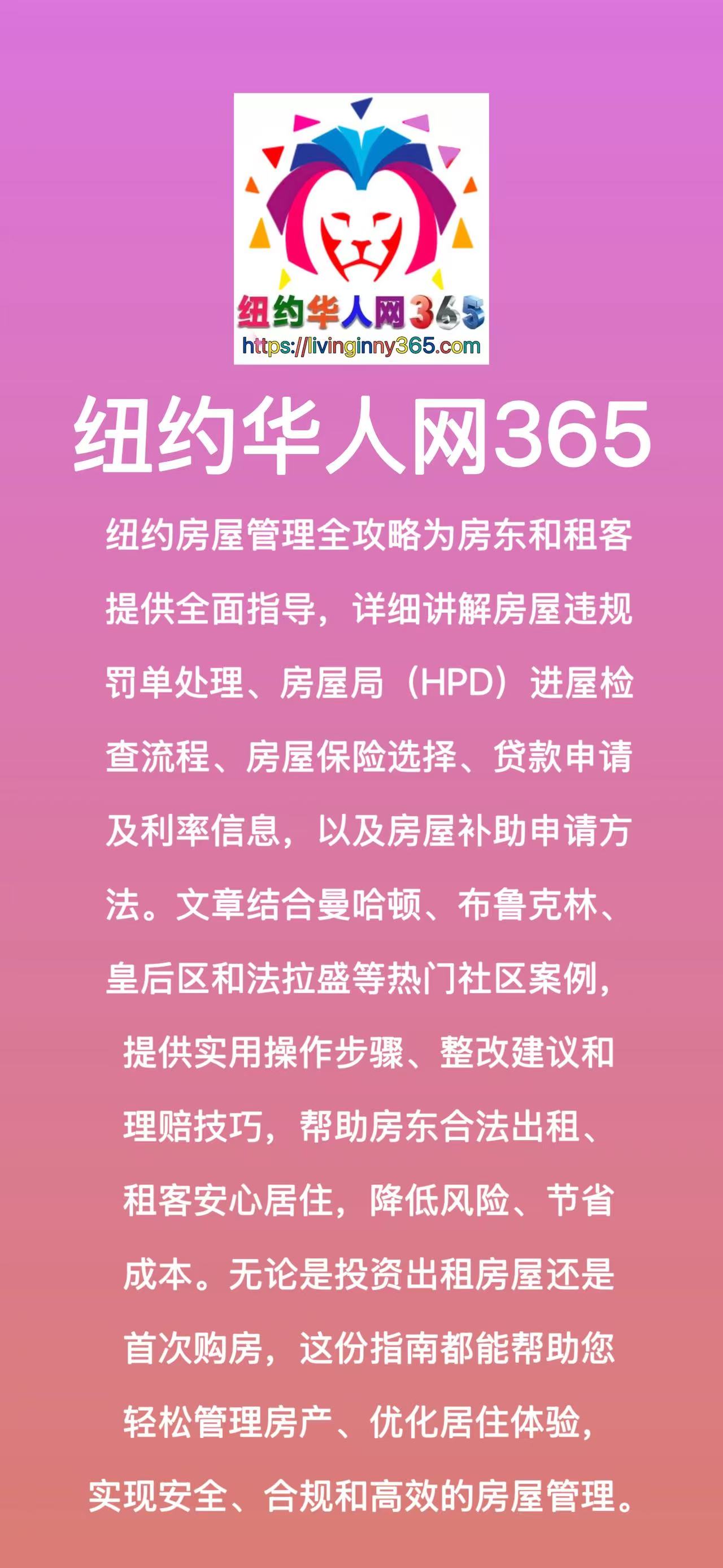 一、纽约房屋违规罚单(NYC Housing Violations)全面解析纽约房屋管理全攻略,从房屋违规罚单、HPD进屋检查、房屋保险、房屋贷款利率,到房屋补助申请流程和租客保护法。详细介绍房东和租客注意事项、整改技巧、保险理赔及贷款申请策略,让您在曼哈顿、布鲁克林、皇后区等纽约各区轻松管理房屋、合法出租、降低风险,实现安全、合规和经济居住。纽约房屋管理指南详细覆盖房东与租客必知事项,包括房屋违规处理、HPD检查流程、房屋保险推荐、贷款利率及申请、房屋补助政策及进屋检查注意事项。结合曼哈顿、布鲁克林、皇后区热门社区案例,提供房屋安全检查、整改、申诉和省钱技巧,帮助您在纽约市合法合规出租或购房,提高房屋管理效率和居住安全,同时最大化房屋投资收益。