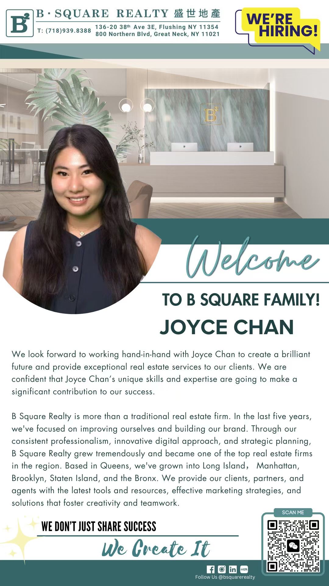 🎉 欢迎Joyce加入B Square Realty大家庭! 🎉Joyce正式开启她的房地产事业新篇章,携手 盛世精英团队,共同书写非凡成就。在B Square Realty,我们不仅提供覆盖 纽约全区的广阔市场资源,更为每一位团队成员配备 前沿工具、培训体系和专业支持,帮助您快速成长,实现业务突破。