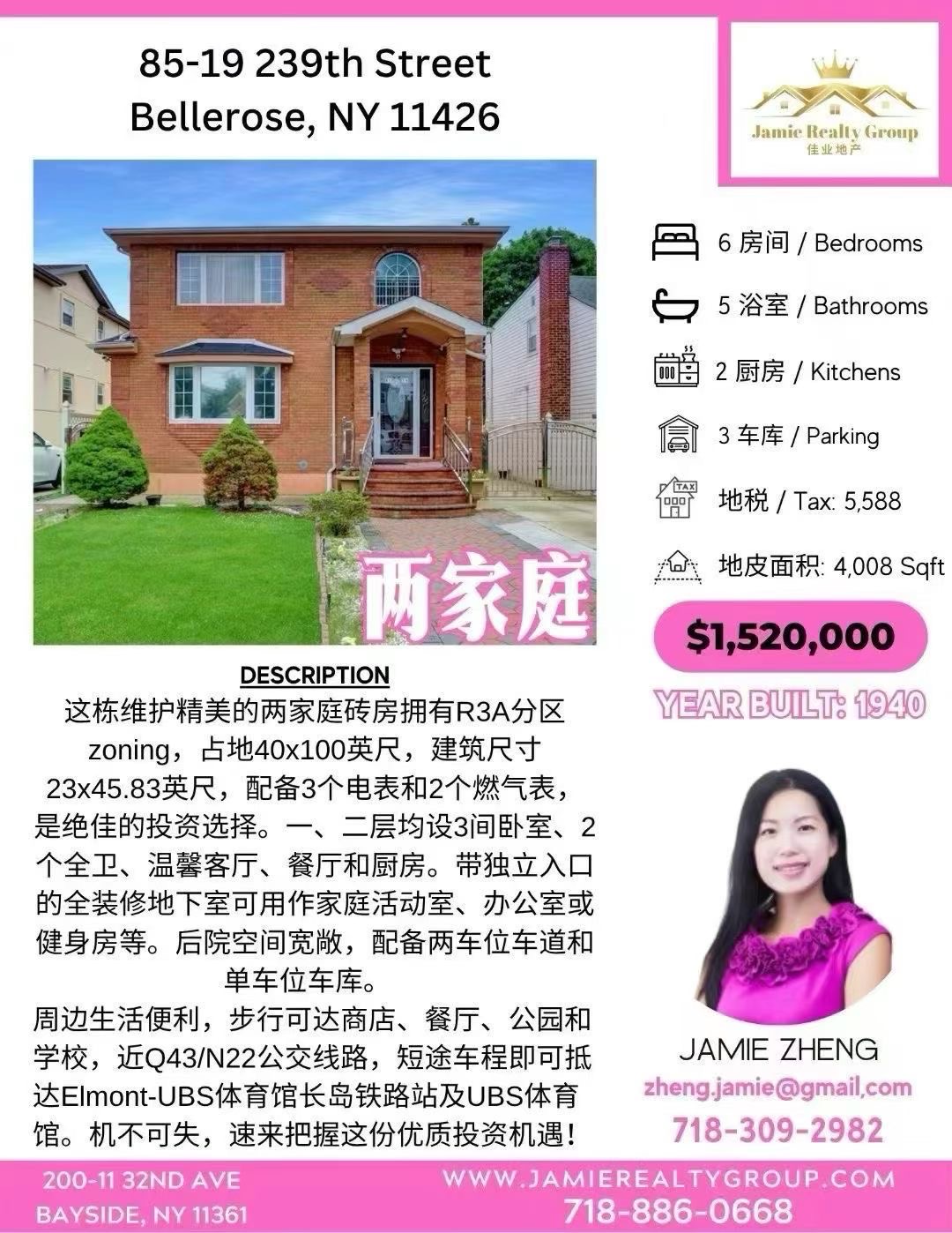 这栋维护精美的 两家庭砖房 坐落于长岛理想地段,R3A 分区 (zoning) 允许灵活使用,无论是自住还是投资均十分适宜。物业占地 40×100 英尺,建筑面积 23×45.83 英尺,提供充足的居住空间与多功能使用可能。