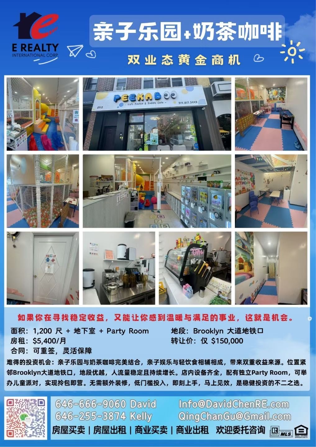 纽约 Brooklyn 布鲁克林大道地铁口 黄金商圈现有一套 亲子乐园+奶茶咖啡双业态生意转让,面积约 1,200平方英尺 + 地下室 + 独立Party Room,适合接手即可营业的投资者。该项目将 儿童娱乐与餐饮业态 完美结合,形成 双重收益模式,无论自用或投资,都是高性价比选择。