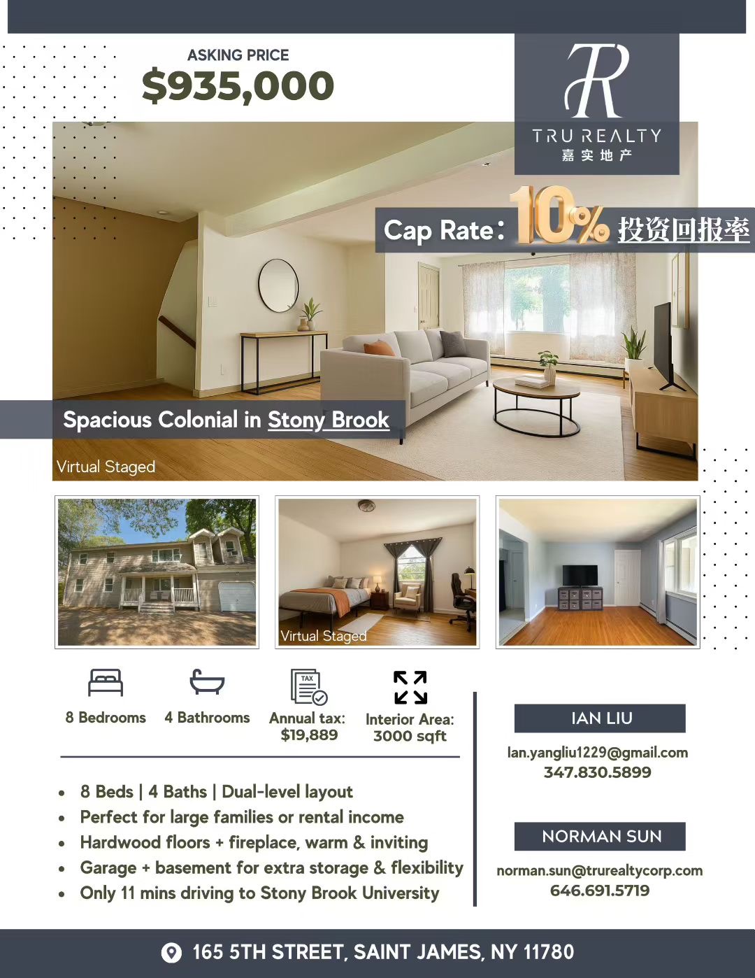 位于 Stony Brook 核心宁静社区 的豪华独栋住宅现已上市,户型宽敞、布局合理,兼具 家庭居住与投资潜力。该物业总面积约 3000 平方尺,适合多代同堂或投资出租。首次公开展示时间为 本周六 1:00-3:00pm,欢迎预约参观。