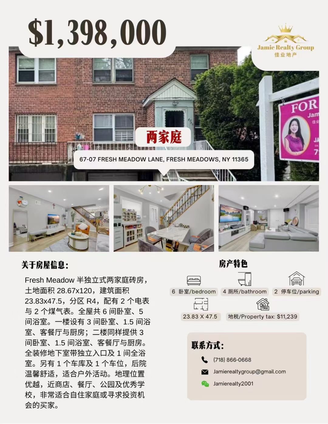 • 投资潜力:Fresh Meadow区域房产需求稳健,双家庭设计为投资者提供可观租金收益,也适合自住与出租兼顾的家庭。