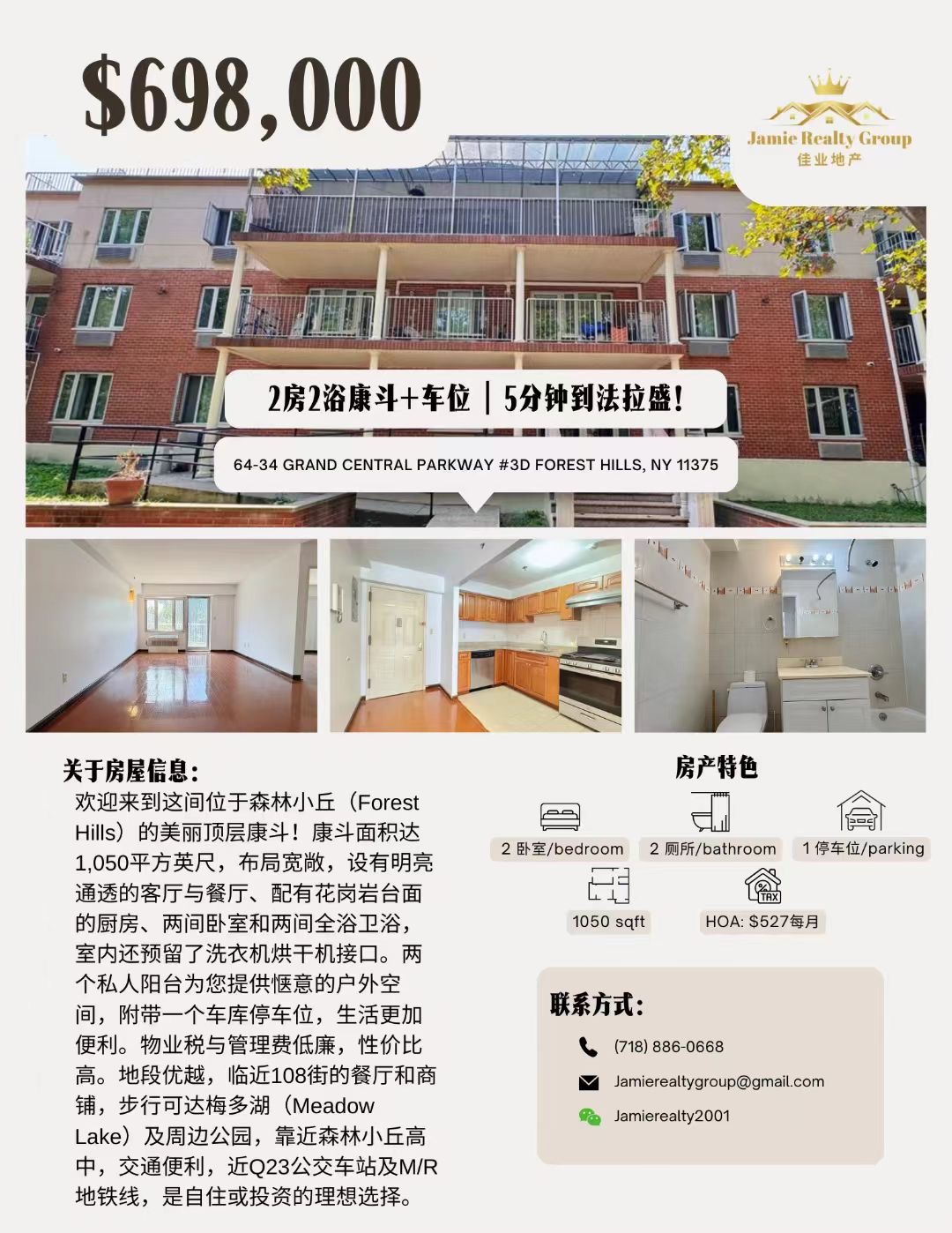 这套 Forest Hills 顶层康斗兼具 舒适、便利与投资潜力,是自住家庭或投资买家的理想选择。无论是享受安静居住环境,还是追求稳定租金收益,这套公寓都能满足您的多重需求。