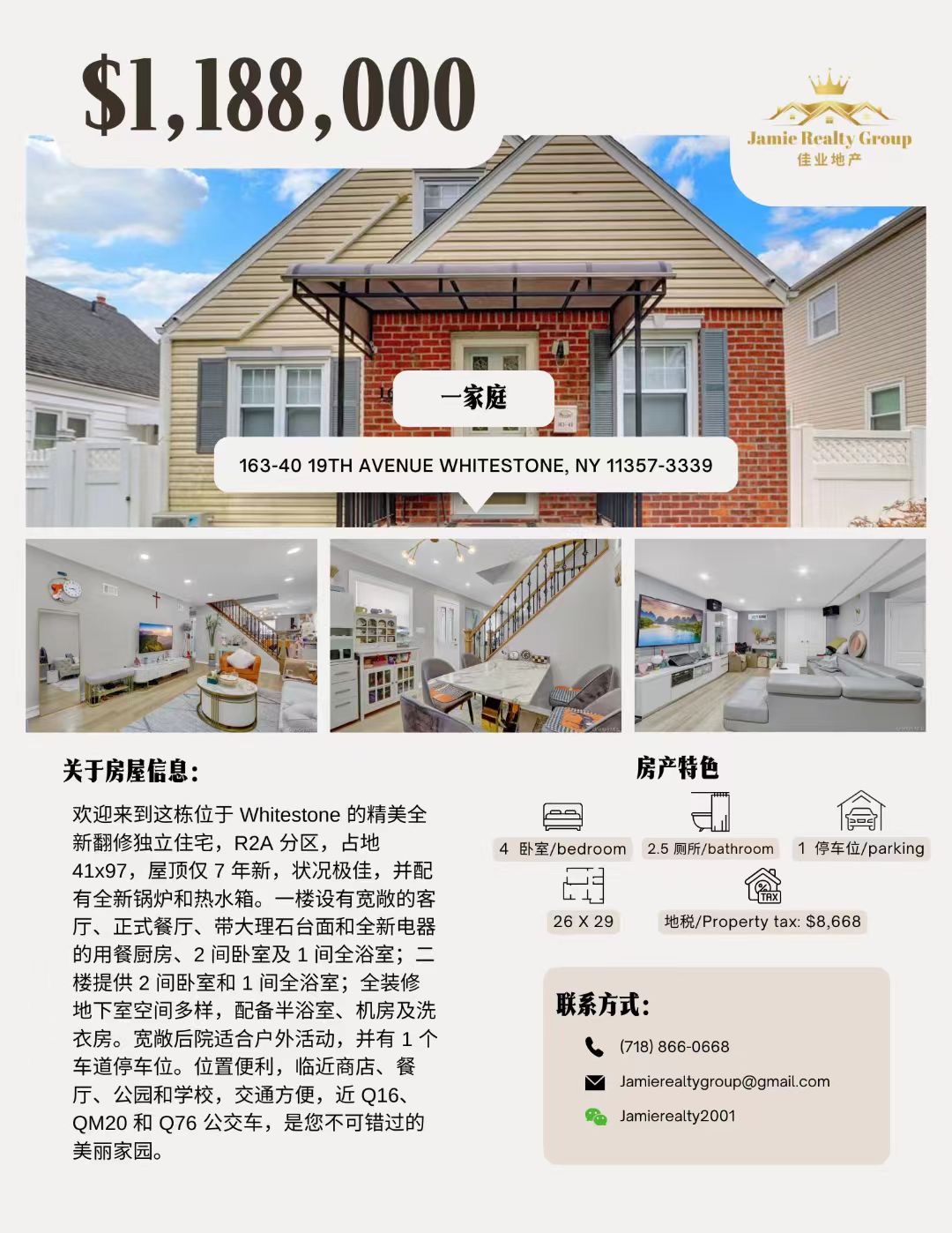 Whitestone 白石镇 的这栋精美独立住宅,这是一套完美结合现代舒适与便利生活的房产。该住宅坐落在 R2A 分区地块,面积约 41x97 英尺,屋顶仅 7 年新,整体状况极佳,同时配备 全新锅炉和热水箱,确保冬季取暖和生活用水的可靠性。无论是自住还是投资,这套房产都具备极高价值。