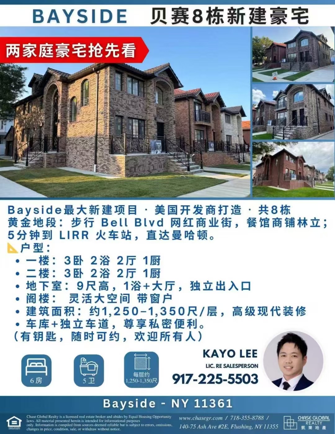 Bayside贝赛重磅新盘!8栋全新双家庭豪宅,Bell Blvd黄金地段,步行5分钟到LIRR直达曼哈顿。户型方正宽敞,每层3卧2浴2厅1厨,附9尺地下室+独立出入口,另有采光阁楼,车库+独立车道停车无忧。现房即享,有钥匙随时看,售价合理,投资与自住两相宜。欢迎买家及同行经纪合作!预约Sophia Yao Team:Sheila 917-650-0731 / Kayo 917-225-5503 / Sophia 929-260-9118。