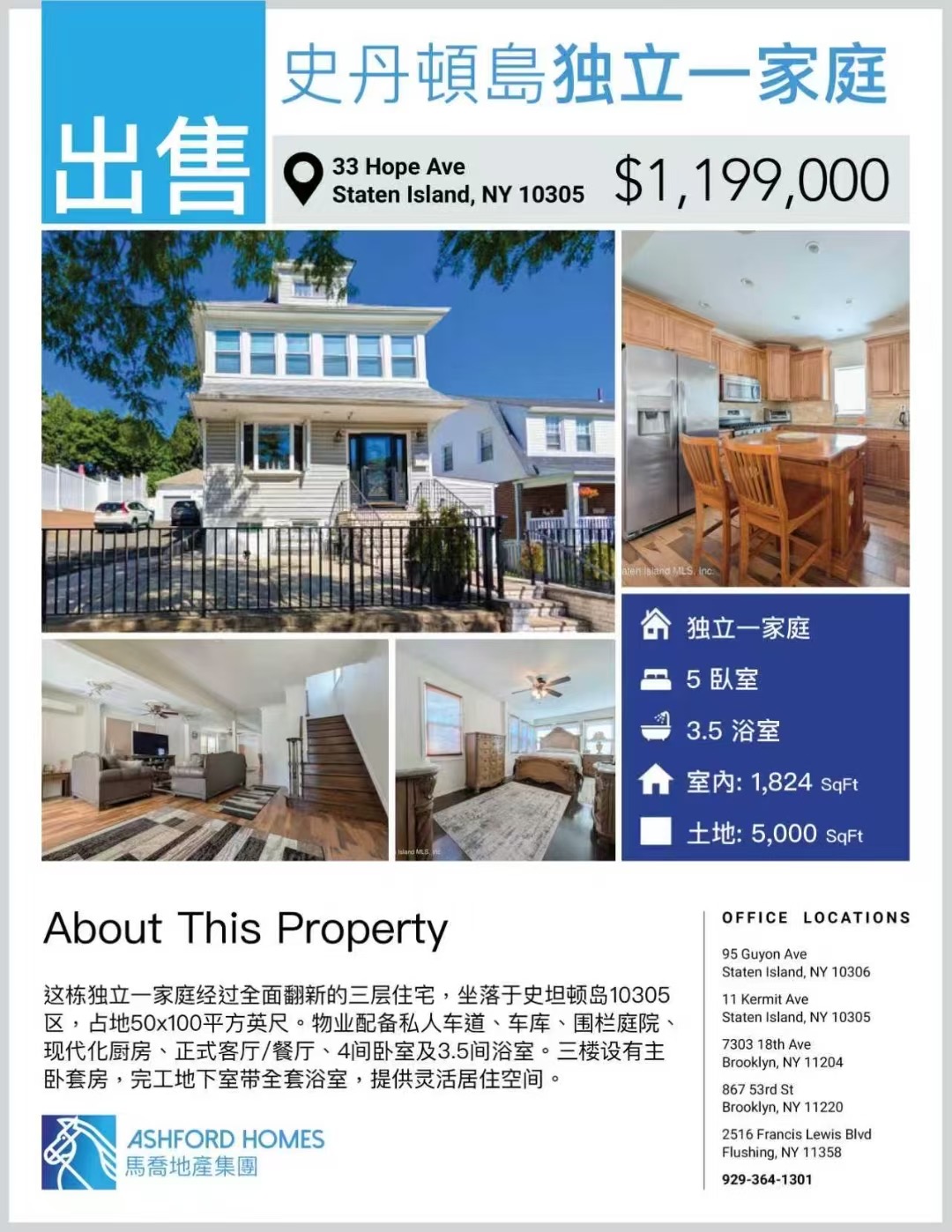 📍 史丹顿岛10305区独立一家庭住宅全面翻新,三层设计,面积宽敞,配备 4间卧室、3.5间浴室,三楼设主卧套房,完工地下室含全套浴室,灵活居住空间。物业附 私人车道、车库、围栏庭院,现代化厨房、正式客厅与餐厅,布局合理,光线充足。适合家庭自住或投资置业。交通便利,社区环境安静优美,预约看房请尽早联系。
