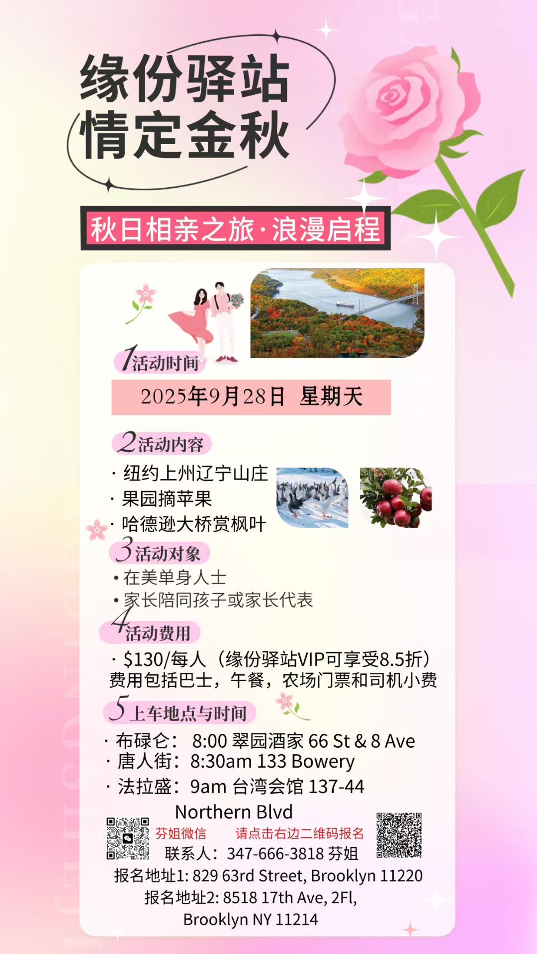 9月28日缘份驿站秋日浪漫相亲之旅,单身男女专属!行程包含辽宁山庄东北农家菜午餐、农场苹果采摘、哈德逊大桥赏枫叶🍁。费用$130/人,包含巴士、午餐、农场门票及司机小费。VIP报名享8.5折优惠。轻松结识新朋友,享受浪漫秋日美景,体验美食与自然乐趣。限量名额,报名从速!