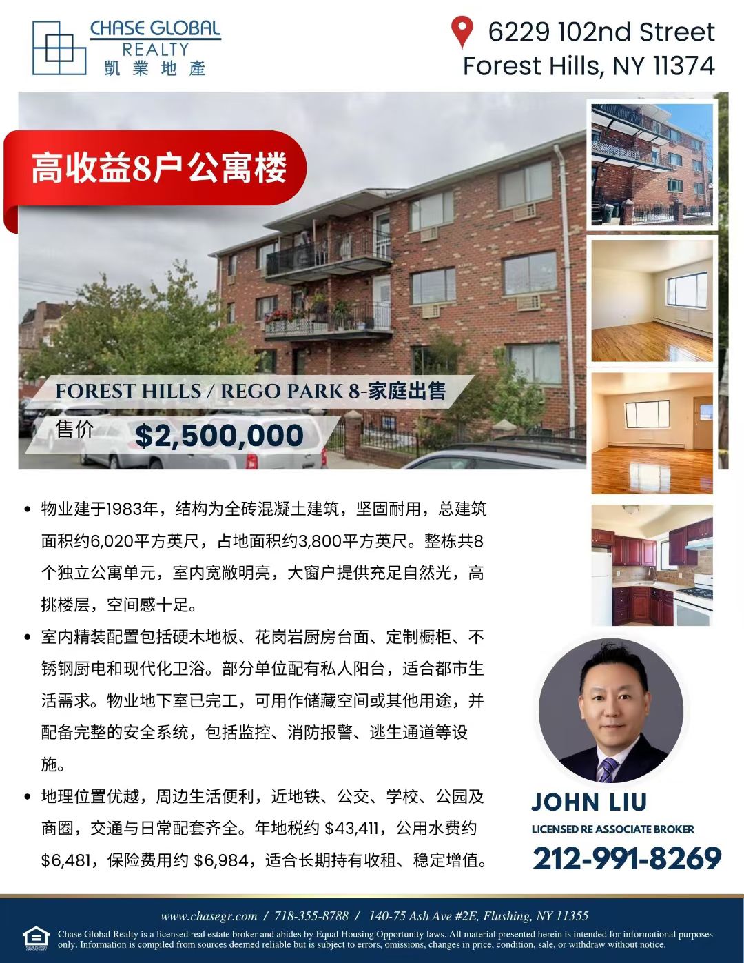 纽约Forest Hills(Rego Park)高收益8家庭公寓出售!📍62-29 102nd Street,位于自由市场无租金管制区域,整栋共8个独立公寓单元,总建筑面积6,020平方英尺,占地3,800平方英尺。室内宽敞明亮,硬木地板、花岗岩厨房台面、定制橱柜、现代卫浴,部分单位带私人阳台。地下室完工,配备安全系统,4个停车位。周边交通便利,近地铁、公交、学校、商圈及公园。稳健投资,长期收租增值佳。📞 联系John刘 212-991-8269