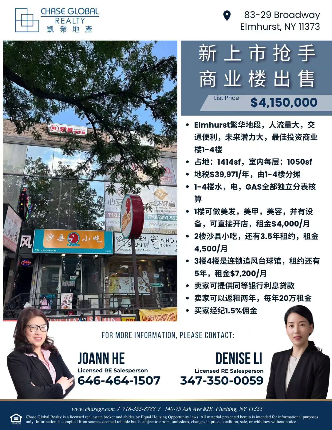 Elmhurst 繁华地段,人流量大,交通便利,未来潜力大,最佳投资商业楼1-4楼,实用面积3,864,售价415万😁,买到就赚到😁