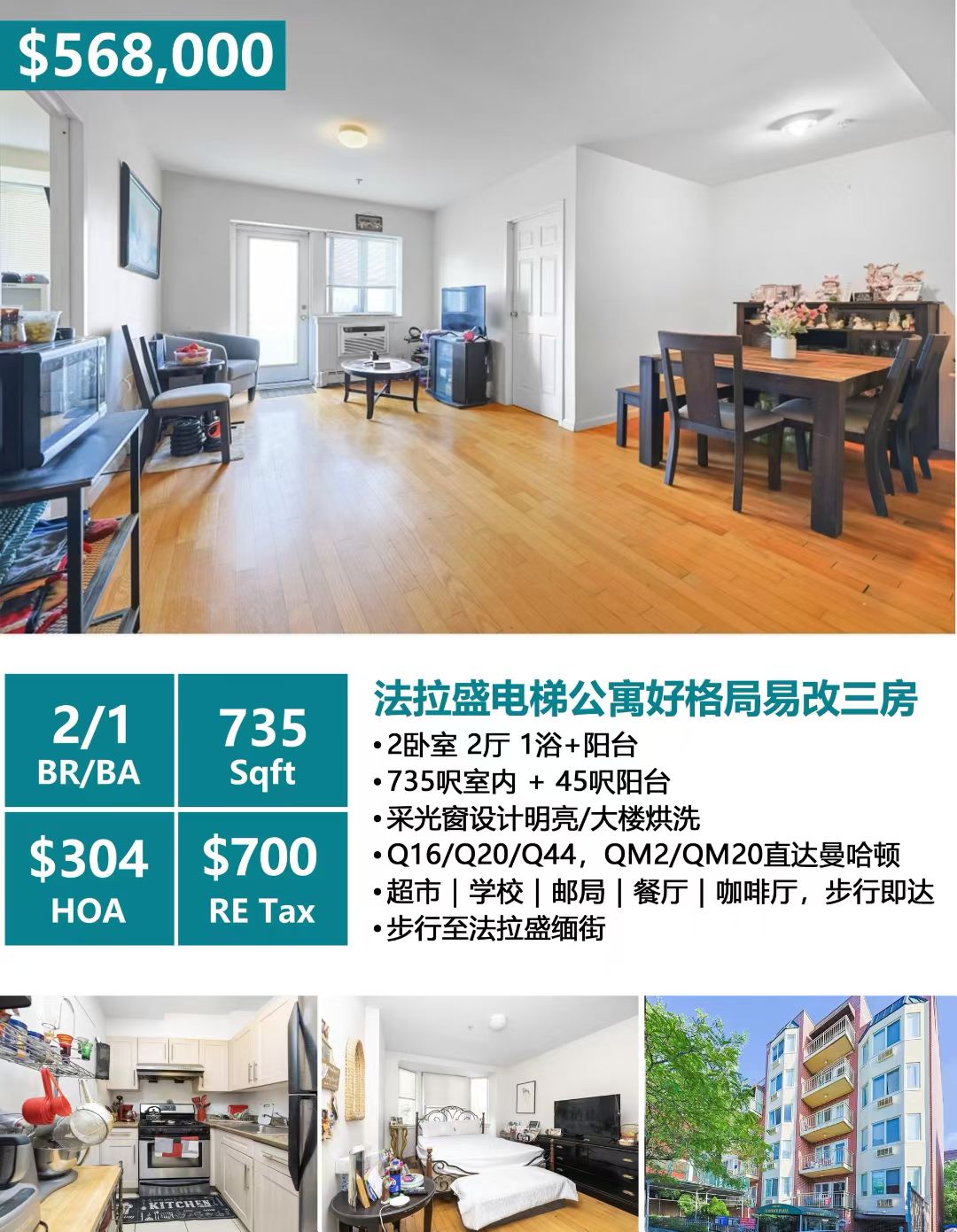 法拉盛三楼电梯Condo康斗热卖,2房1卫2厅,带45平方呎阳台,格局方正,易改三房。室内约735平方呎,大窗墙设计全天采光充足。大楼配监控与公共洗衣房,安全便捷。交通便利,多条公交(Q16/Q20/Q44、QM2/QM20快巴)直达曼哈顿;步行即可到超市、餐厅、学校、邮局、咖啡厅,距离法拉盛缅街仅几分钟。舒适居住环境+便利生活设施,难得好房,抓紧机会!