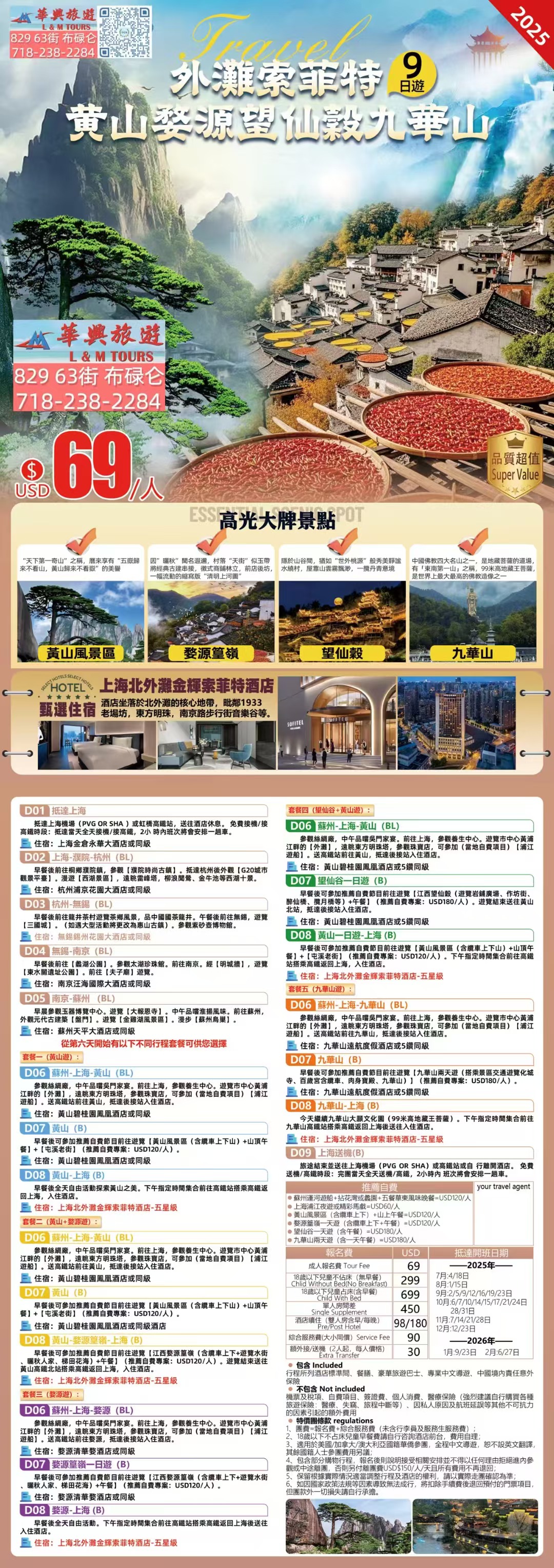秋季限定9天仙境之旅!探访黃山奇景、婺源曬秋美景、望仙谷梦幻灯火、九華山佛国祈福,尽享中国最美秋色。入住上海北外滩索菲特豪华酒店1晚,俯瞰黄浦江夜景。每周发团,仅9–11月限定,名额有限,错过再等一年!立即预订,体验秋日仙境、云海红叶与佛国祈福之旅,收获难忘美好回忆。