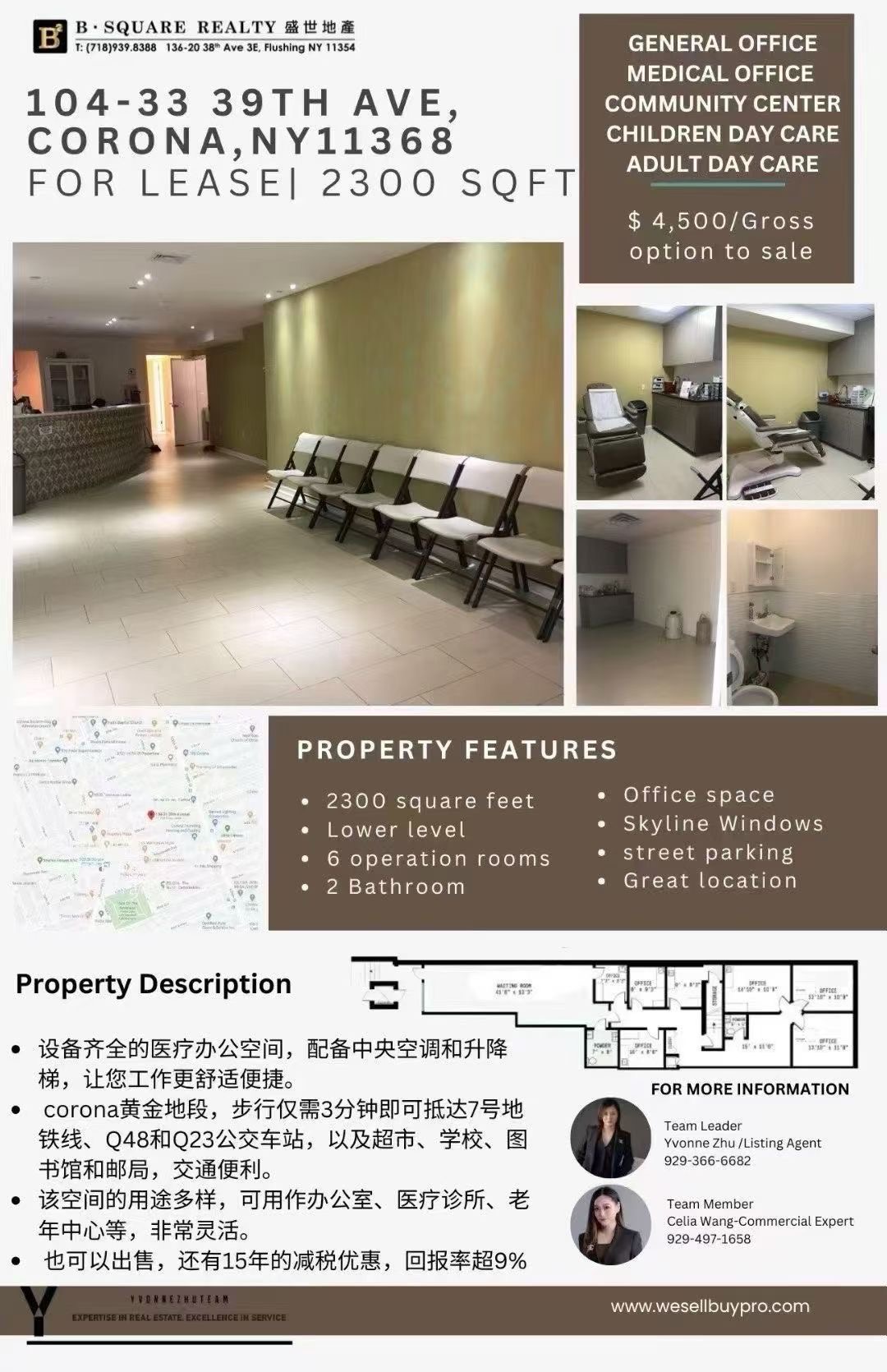 这是一处位于纽约皇后区可乐娜(Corona)黄金地段的稀缺医疗办公空间,目前对外出租或出售。不论是医疗诊所、牙科诊所、康复中心,还是企业办公室、老年中心或培训机构,这套房源都能满足不同业主的需求。