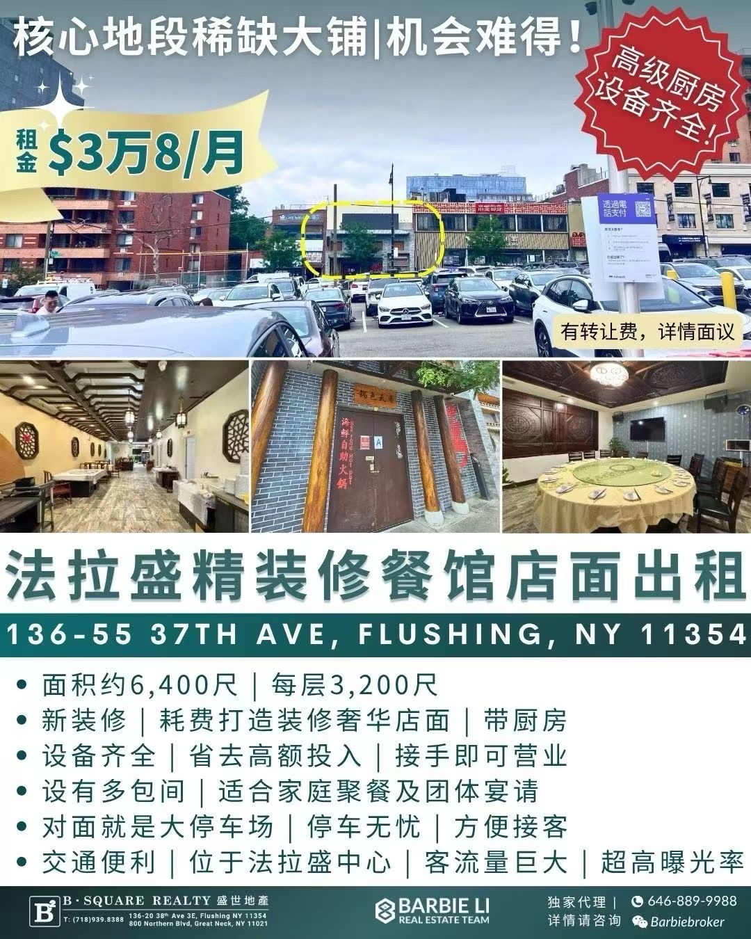 盛世地产 Barbie Li Team 为您精选的这些 纽约商业出租房源,不仅具备黄金地段和高人流量,还提供多元化用途选择,是创业者开业、投资者收租的理想选择。无论是餐饮开店、零售运营、医疗诊所还是办公室使用,灵活的空间和完善的配套设施,都能让您省心省力,快速投入运营。