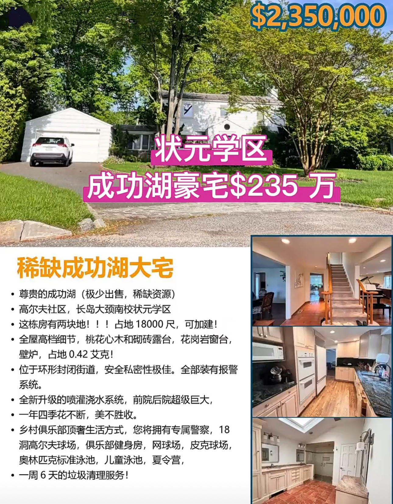 大颈成功湖尊贵稀缺大宅出售,占地0.42英亩,可加建,售价$2,350,000。全屋高档细节:桃花心木、砌砖露台、花岗岩窗台、壁炉。私密封闭街道,配套报警系统,升级喷灌系统,前后院景观精美四季鲜花不断。尊享顶奢社区生活:专属警察安保、18洞高尔夫球场、健身房、网球场、皮克球场、奥林匹克泳池及儿童泳池、一周6天垃圾清理服务。📞预约参观:646-301-7453 / 917-619-6888