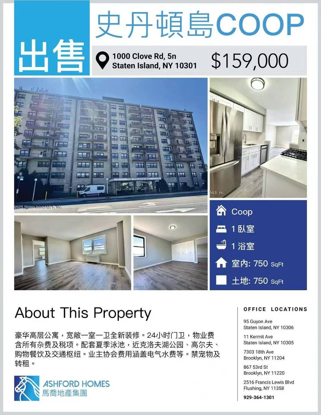 史丹顿岛1000 Clove Rd 5N豪华高层COOP新上市,售价$159,000,750平方英尺一卧一卫,全新装修,宽敞明亮。物业费含所有杂费及税项,24小时门卫保障安全。小区配套完善,包括夏季泳池,靠近Clove湖公园、高尔夫球场、购物餐饮及交通枢纽。业主协会费用涵盖水电,生活便利。禁宠物及转租,自住或投资皆宜。