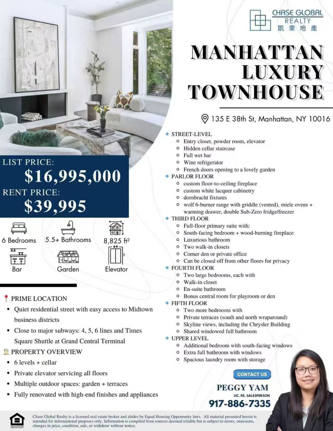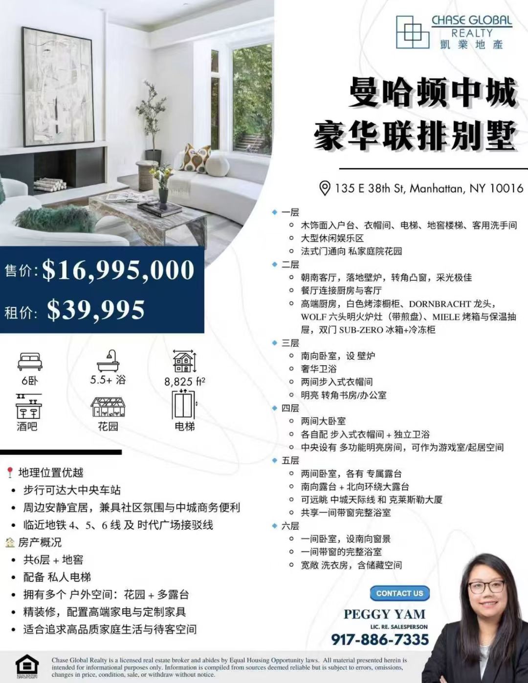 曼哈顿中城独家豪华联排别墅出售!总共6层+地窖,配备私人电梯、多露台及花园,精装修高端家电与定制家具齐全,兼具家庭舒适与待客空间。地理位置优越,步行至大中央车站,临近地铁4/5/6线及时代广场接驳线,安静宜居又方便商务活动。售价$16,995,000,租金$39,995/月。凯业地产独家代理,欢迎合作与预约看房☎️Peggy Yam 917-886-7335