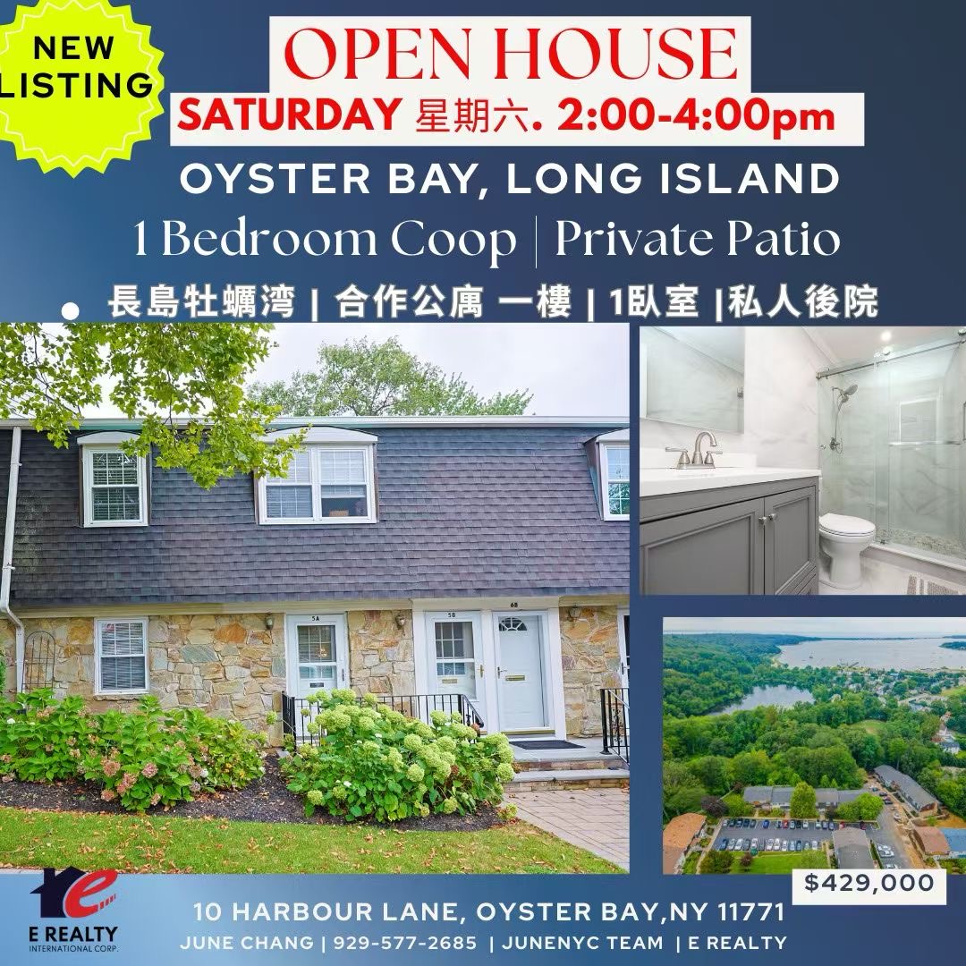 長島Oyster Bay Top of the Harbour社区一楼Co-op美屋现开放公展,售价仅$429,000,附私人庭院和绿意景观。房屋面积宽敞明亮,适合自住或投资。管理费含暖气、热水、停车、园艺、除雪及垃圾清理,拎包入住无忧。