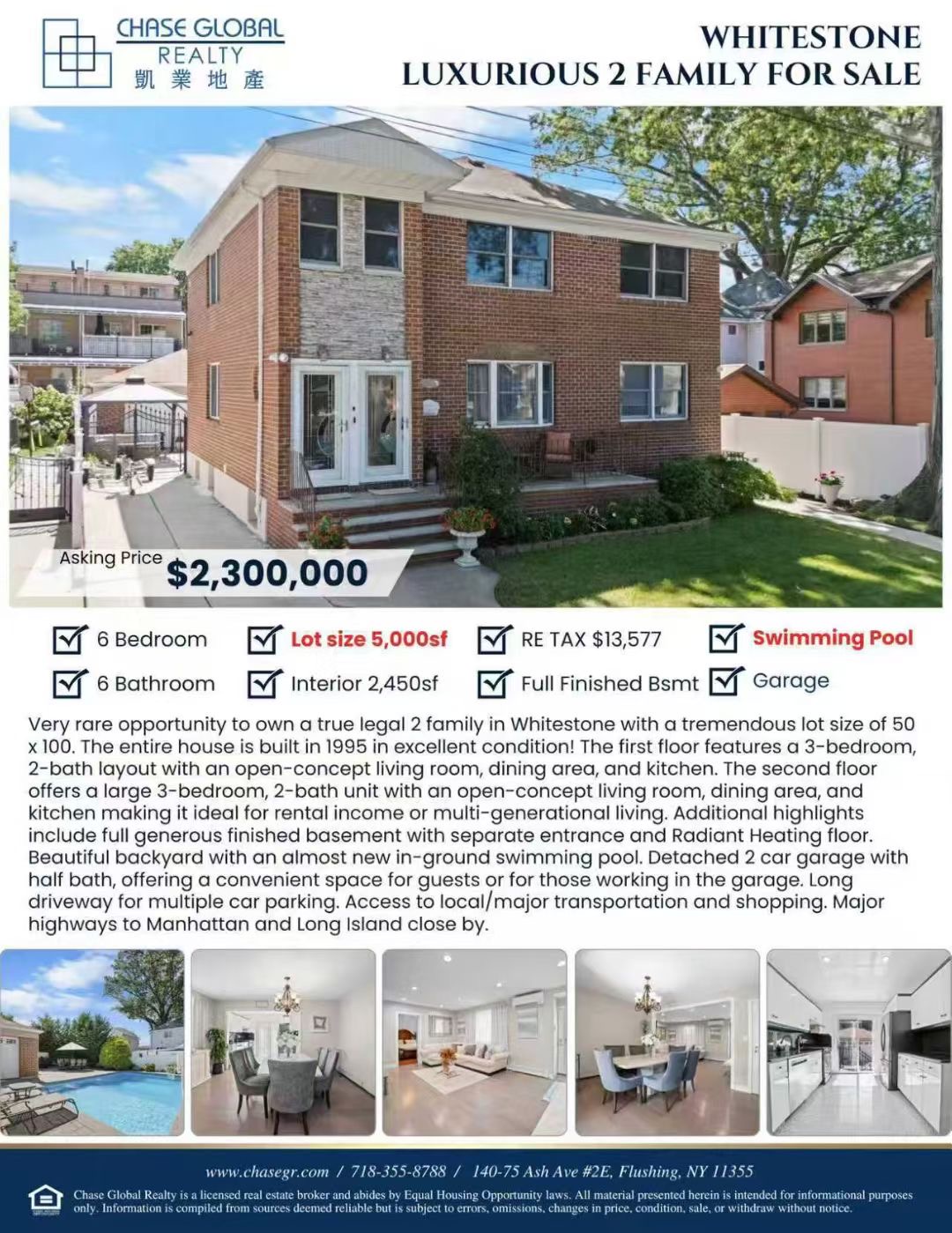 Whitestone高端现代两家庭住宅,2023年全新装修,地块5000呎(50x100),房屋面积2450呎,6房5全浴,每层独立出入,地下室全装修带地暖和独立出口。特色设施包括6年新恒温海水泳池16’x25’,车库配全浴/游泳更衣室,后院高级凉亭、欧洲进口Pizza炉和烤炉。豪华用材,布局合理,投资自住皆宜。欢迎合作转发,有兴趣请联系Erin Wang 646-556-5527。