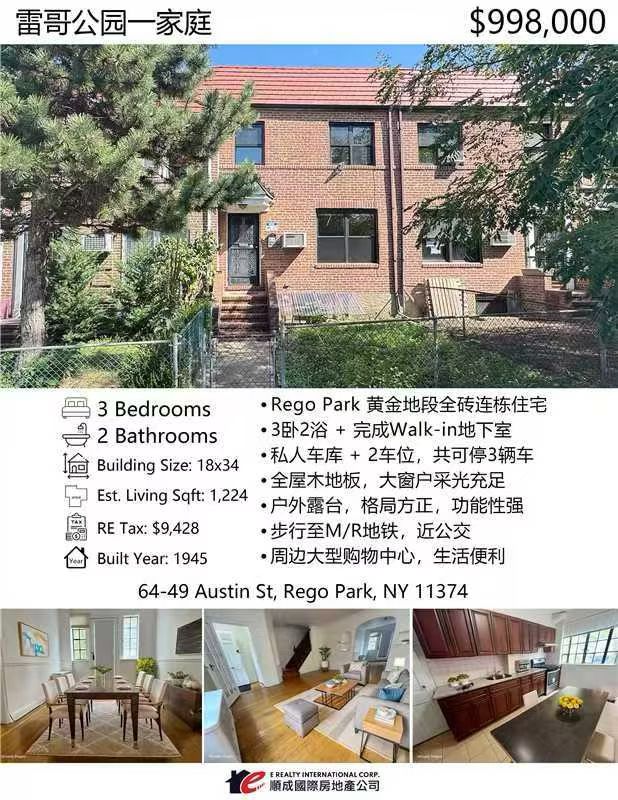 🌟Rego Park黄金地段全砖连栋住宅出售,售价$998,000。3卧2浴,完成Walk-in地下室,空间宽敞实用。配备私人车库及2车位,总共可停3辆车。全屋木地板,大窗户采光充足,户外露台设计,格局方正,功能性强。步行可达M/R地铁及多条公交线路,周边购物中心、餐饮、超市、公园应有尽有。理想自住或投资房源,机会难得!☎联系Mechelle齐 929-888-0202(微信同号:m8880202)