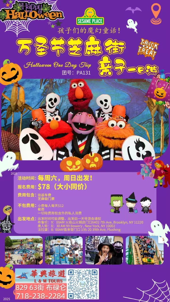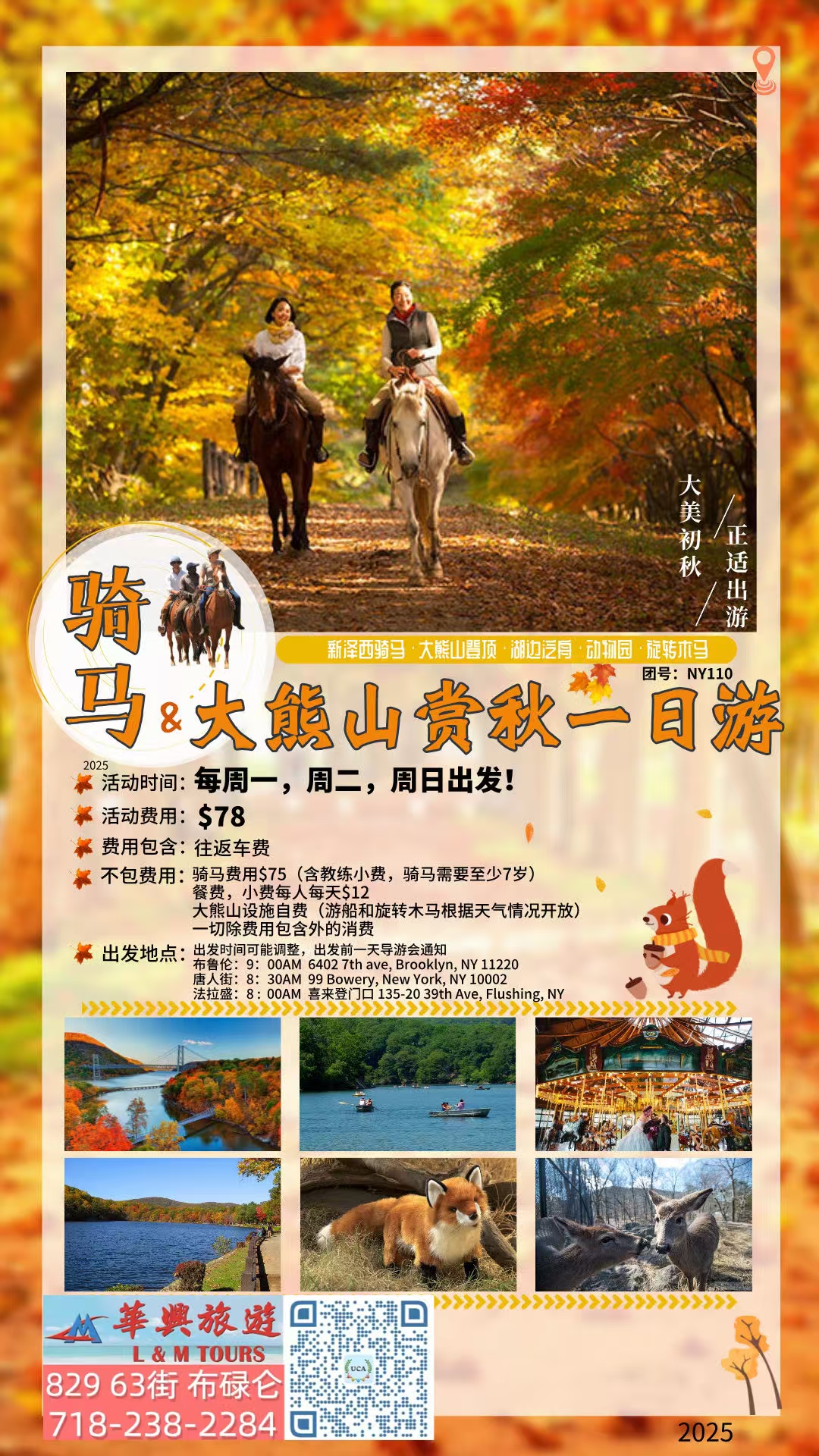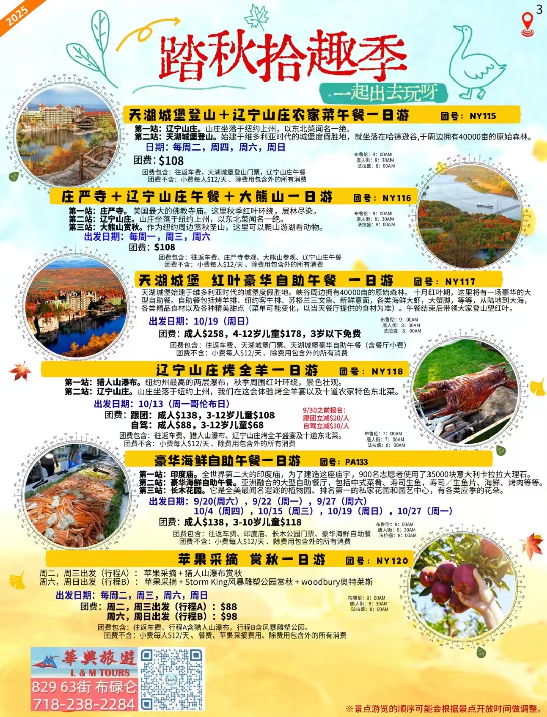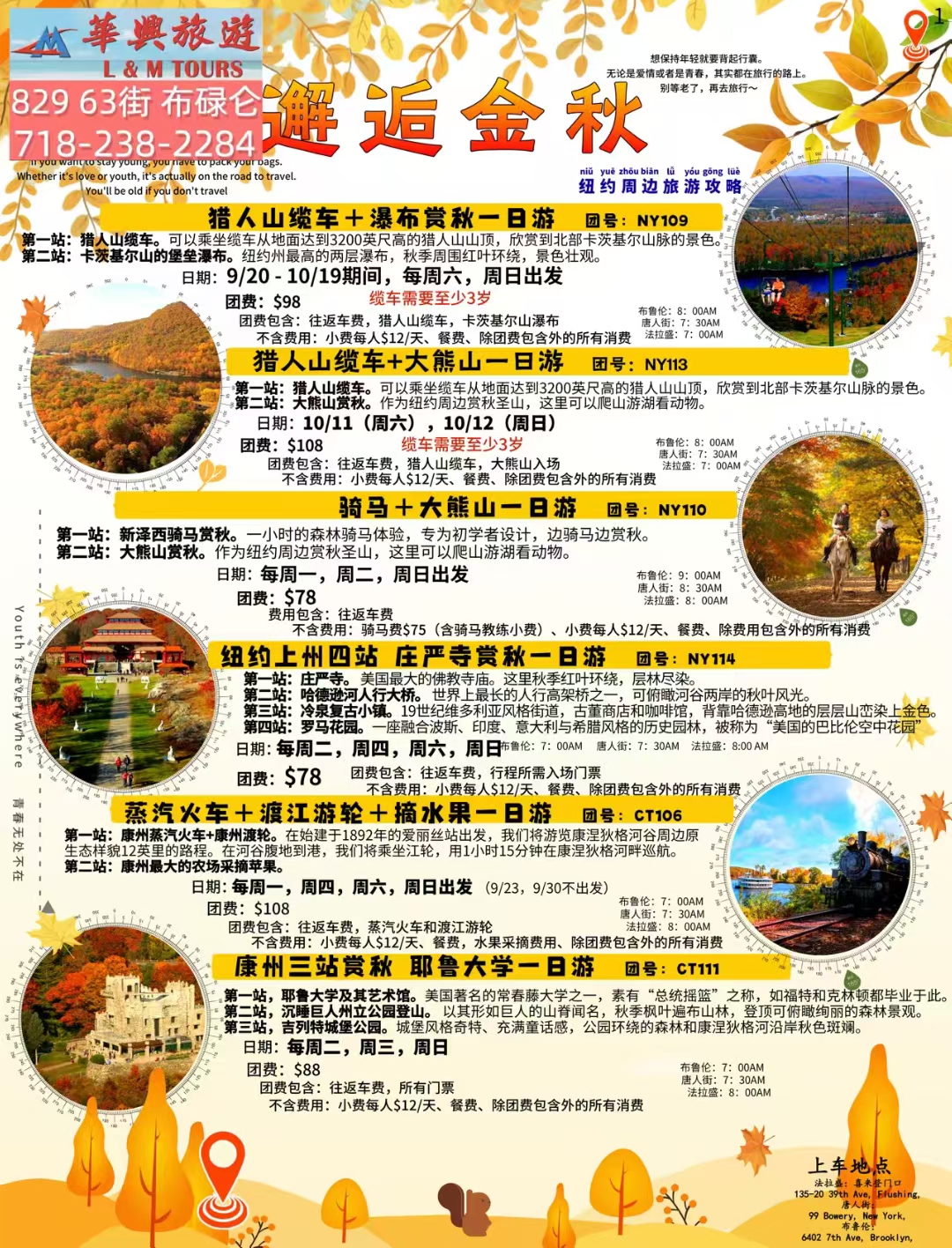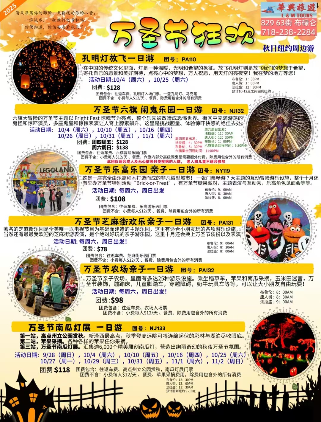 🍁2025秋季纽约周边精选一日游大集合!乘坐蒸汽火车穿越康州原生态美景,体验渡江游轮浪漫风光;带孩子探索全球最大乐高乐园,七大主题区互动玩乐;夜晚放飞孔明灯,寄托心愿与梦想;体验六旗万圣节惊魂节,挑战胆量尖叫不停;农场采摘苹果、水果,亲子互动乐趣无穷;穿越猎人山、卡茨基尔山、森林瀑布等秘境,欣赏绝美红叶秋景。行程集合地点布鲁克林、唐人街、法拉盛,费用合理,部分含门票与车费,小费及餐费自理。秋季最丰富、最适合家庭、情侣、好友的周末活动,让你一次玩遍自然、美食与文化,留下难忘回忆。