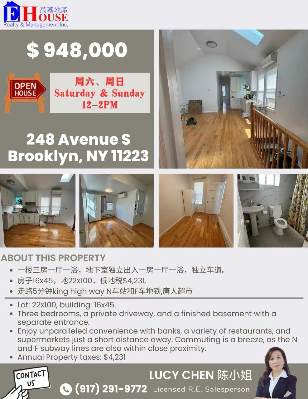布鲁克林Kings Highway独家代理住宅出售,地址248 Ave S, Brooklyn,单边一家庭可改作二家庭使用。房屋豪华装修,一楼3房1厅1浴,地下室独立出入1房1厅1浴,独立车道。地块22x100,房屋16x45,低地税$4,231/年。步行5分钟即可到N/F车站及唐人超市,生活便利。房源已配钥匙,可随时看房。售价$949,000,欢迎合作转发或咨询☎️917-291-9772 陈小姐