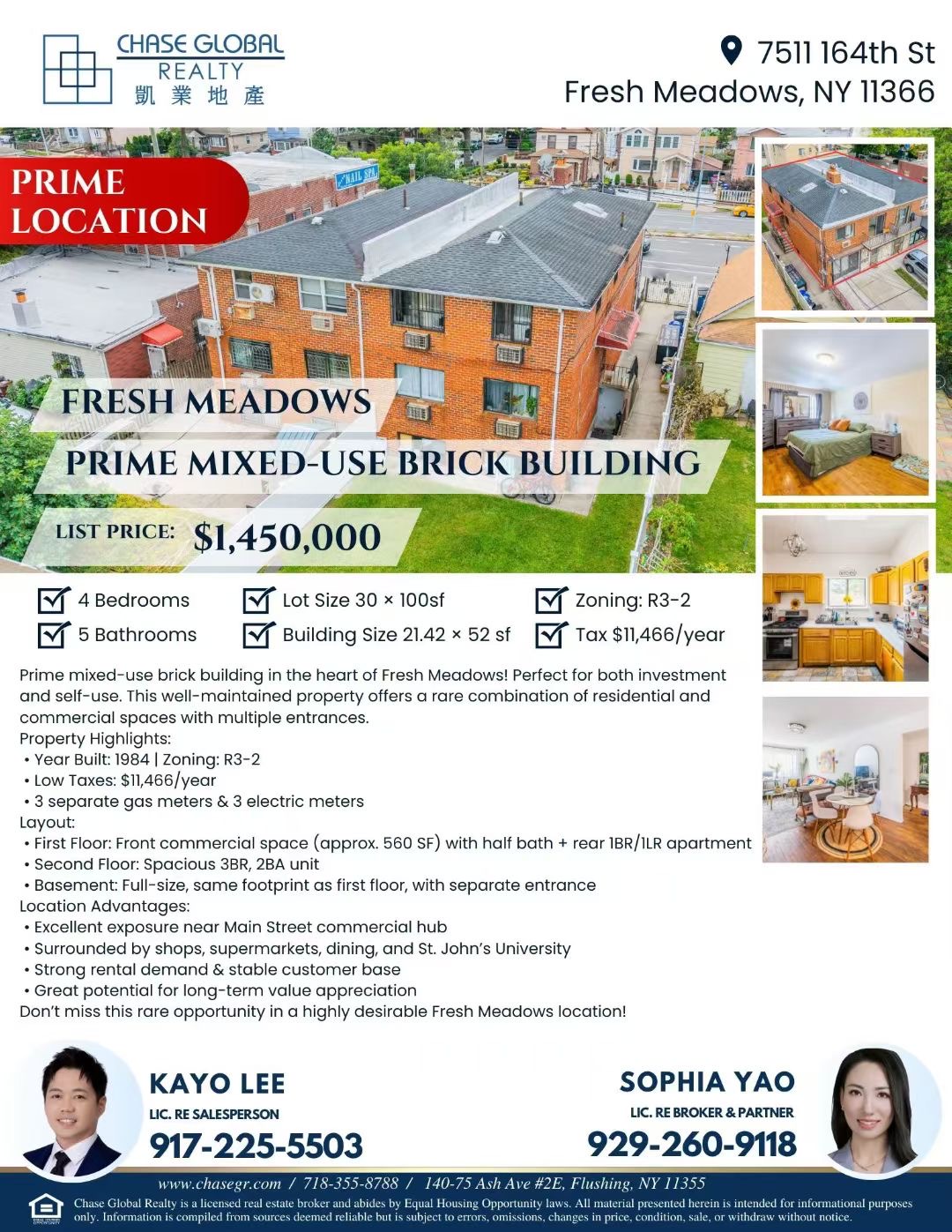 该物业投资潜力大,兼具自住与商业收益,适合多种用途。Fresh Meadows稀缺房源,抓住机会,欢迎预约看房。联系人:Sophia Yao 929-269-9118 / Kayo Lee 917-225-5503。