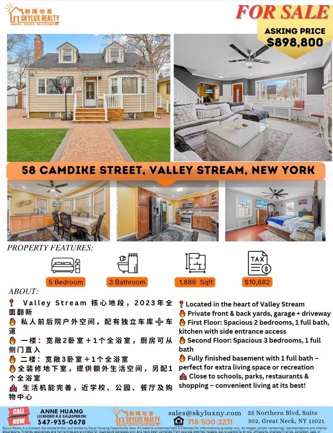 • 位于Valley Stream黄金地段,周边社区稳定,租赁市场和未来增值潜力均优。