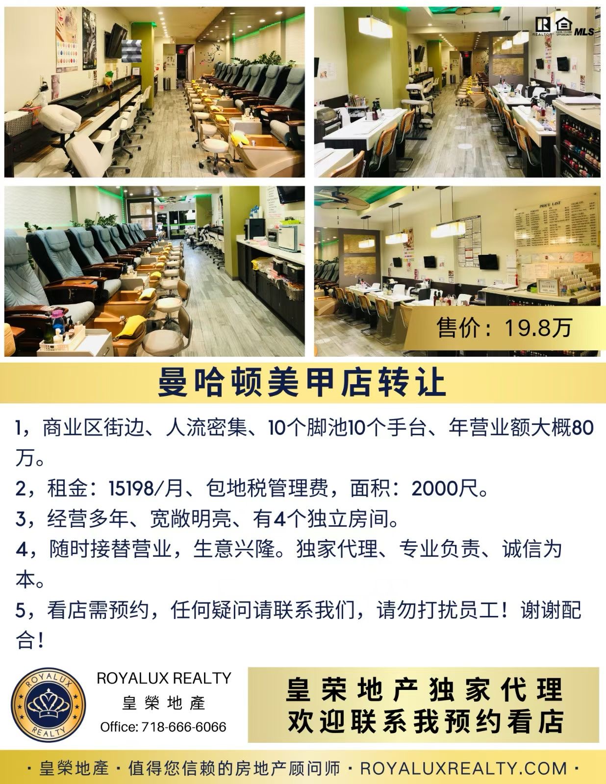 曼哈顿美甲店转让,由皇荣地产独家代理,售价19.8万。店铺位于商业区街边,人流密集,拥有10个脚池和10个手台,年营业额约80万。店面宽敞明亮,经营多年,设有4个独立房间,租金$15,198/月,包地税及管理费,面积约2000平方尺。生意稳定,随时接手可营业,独家代理,专业负责,诚信为本。看店需预约,详情请联系负责经纪 Sara:347-913-6868。