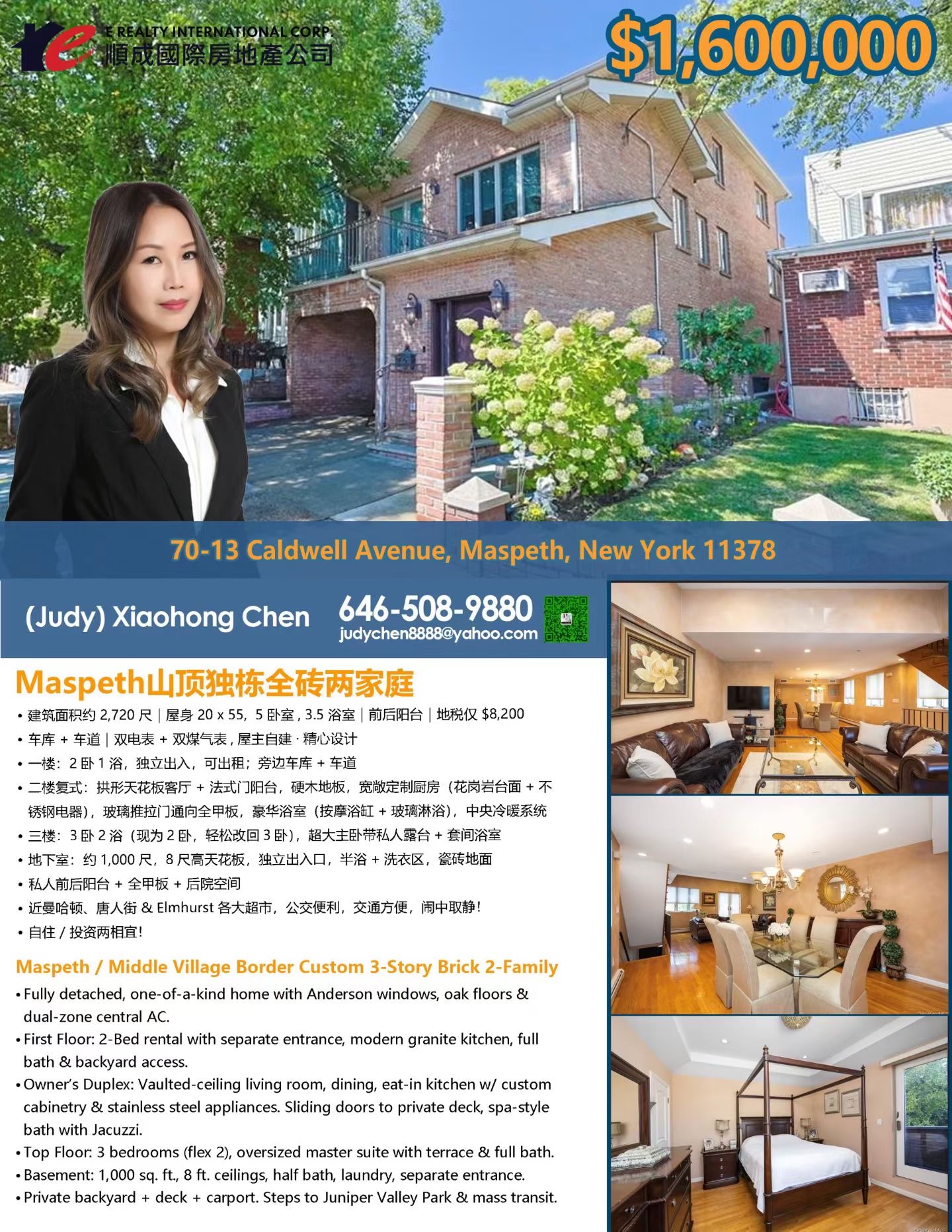 Maspeth皇后区精美全砖两家庭独栋出售,总价$1,600,000。屋宽20x55,总面积2720平方尺,共5卧3.5卫,前后阳台,地税$8,200。屋主自建房,设计精美,空间开阔,配置高端。一楼二房一卫带独立出入及车库车道;二楼复式公寓带拱形天花板、法式阳台门、定制厨房和花岗岩台面电器,三楼三卧两卫(可灵活改造),地下室约1000平方尺,8英尺高天花板、独立入口、洗衣区和半浴室。交通便利,靠近曼哈顿、唐人街及Elmhurst多家超市。投资自住首选!周末Open House 12-2点,欢迎预约。
