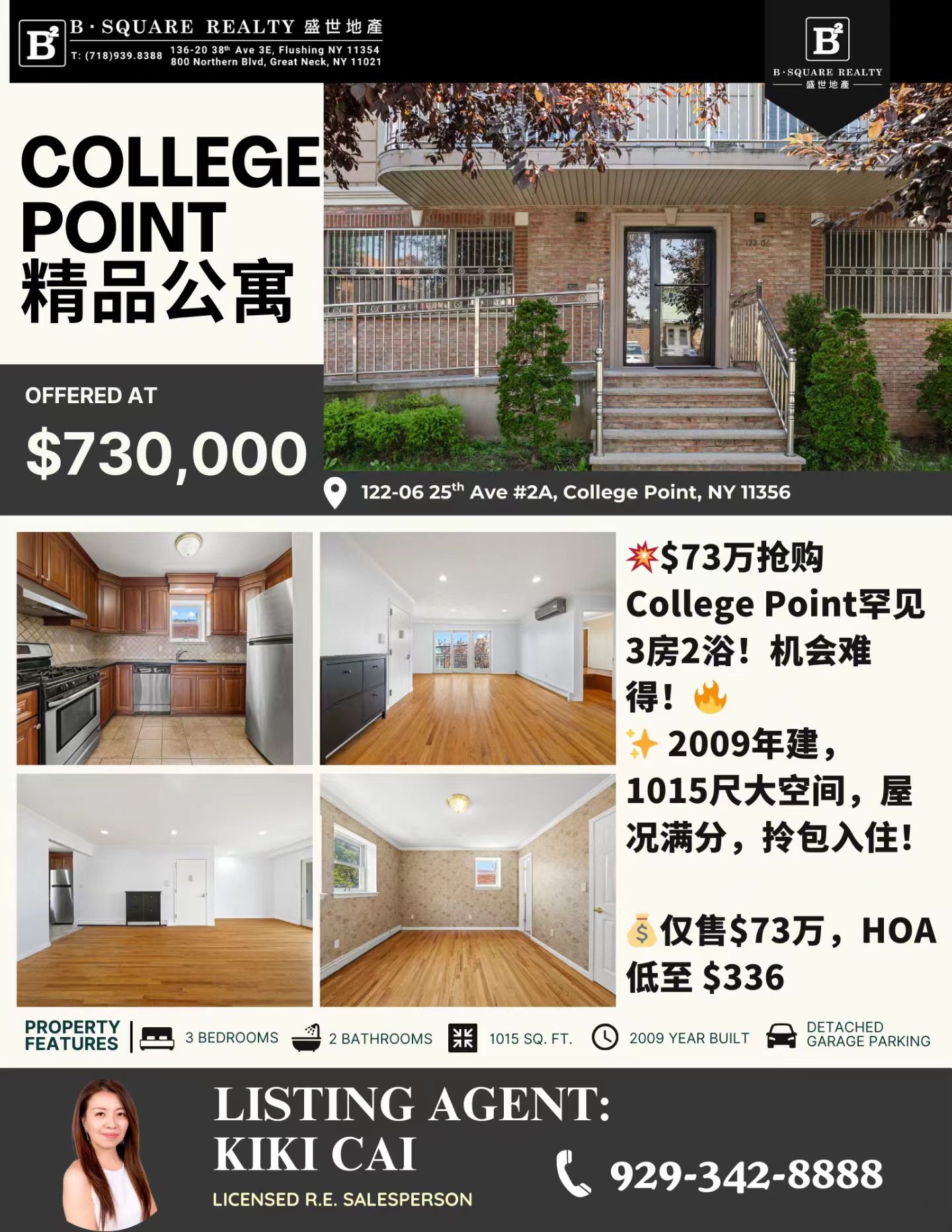 College Point黄金地段罕见3房2浴公寓火热上市!建筑于2009年,总面积1015平方英尺,屋况完美,拎包即可入住。低至$336的HOA费用,性价比极高,适合自住或投资出租。房源位于12206 25th Ave #2A,交通便利,靠近学校、购物及主要道路,生活便捷。仅售$73万,机会难得,投资潜力显著。无论是首次置业、家庭自住,还是增值出租,College Point公寓都是理想选择。欢迎房产经纪合作转发,获取第一手优质房源信息!