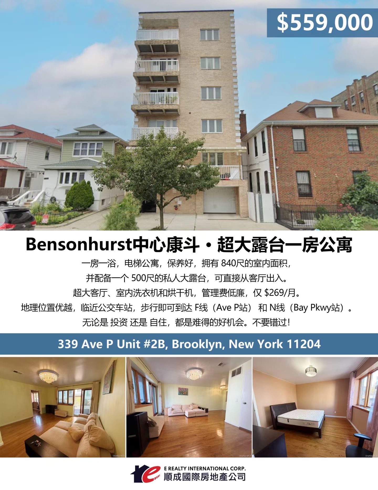 布鲁克林Bensonhurst核心地段,稀缺大露台电梯康斗最新上市!一房一浴,室内面积840尺,外加500尺私人大露台,客厅直通露台,享受阳光与舒适生活。全屋保养好,带室内洗衣机+烘干机,管理费仅$269/月。步行可达F线Ave P站与N线Bay Pkwy站,交通购物生活便利。售价$559,000,投资或自住都是超值选择!欢迎预约看房。