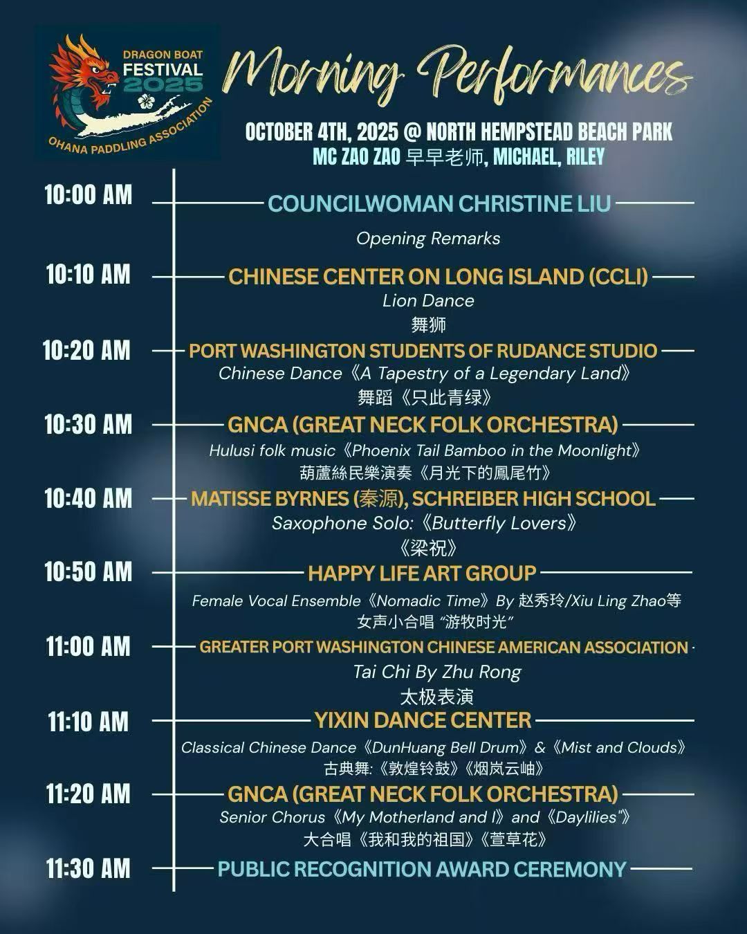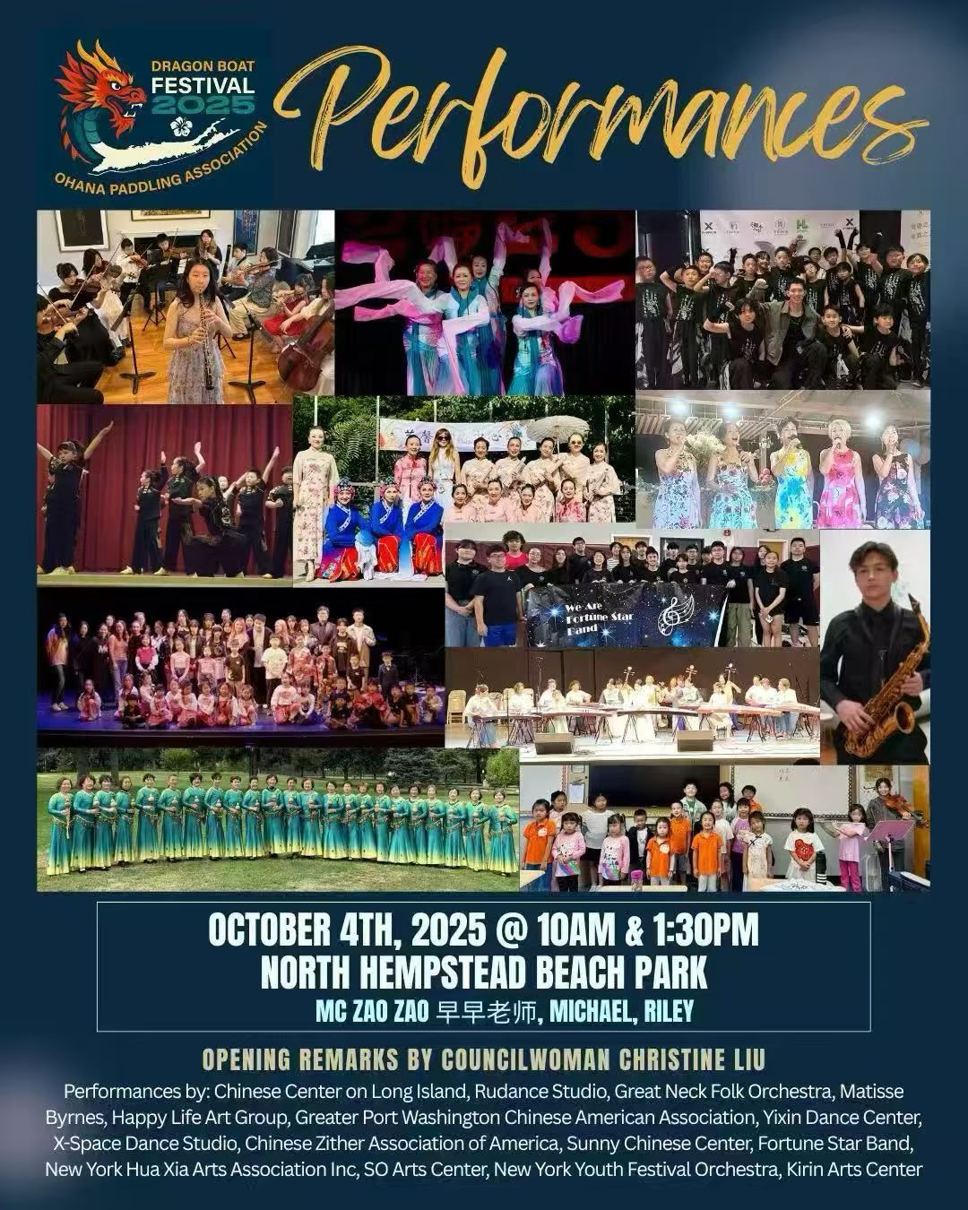 长岛首届龙舟节及中秋灯会将于10月4日在Port Washington的North Hempstead Beach Park盛大举行!现场有激烈的龙舟比赛、热闹民族文化表演、以及免费的中秋水灯派送。全天精彩活动,适合全家老小一同参与。无论是观赏龙舟竞技、感受中华传统文化,还是带孩子体验手作灯笼与水灯放飞,这里都是中秋节最佳去处。快来和亲朋好友共度温馨欢乐的中秋夜吧!