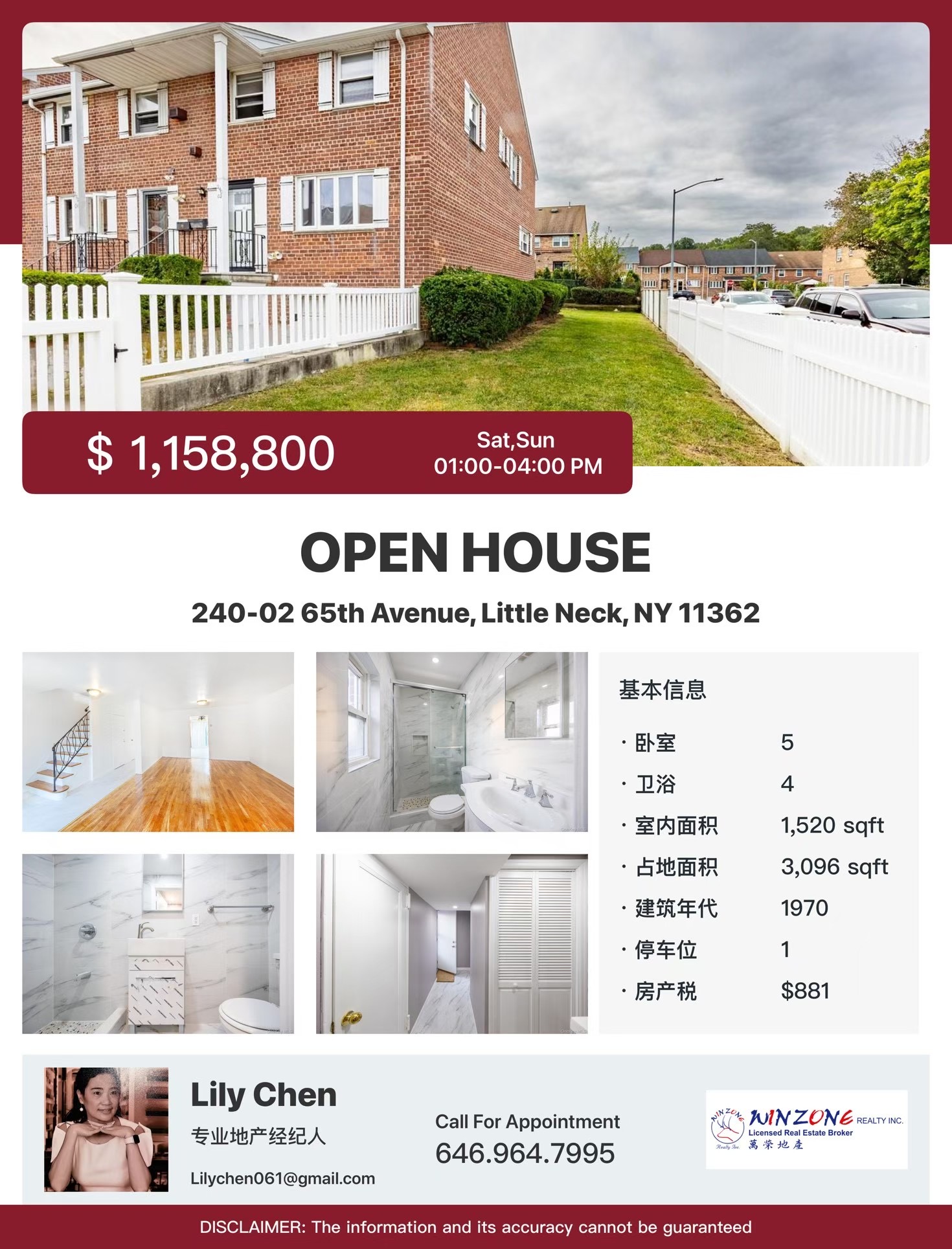 Little Neck 小颈独栋住宅开放参观!5卧4卫、室内面积1520平方尺,占地3096平方尺,建于1970年,附1个车位,房产税低仅$881/月。房屋格局宽敞,适合家庭居住,周边学区优质,生活交通便利。专业地产经纪 Lily Chen 全程协助预约看房,欢迎合作转发。预约请联系:646-964-7995 或 LilyChen061@gmail.com
