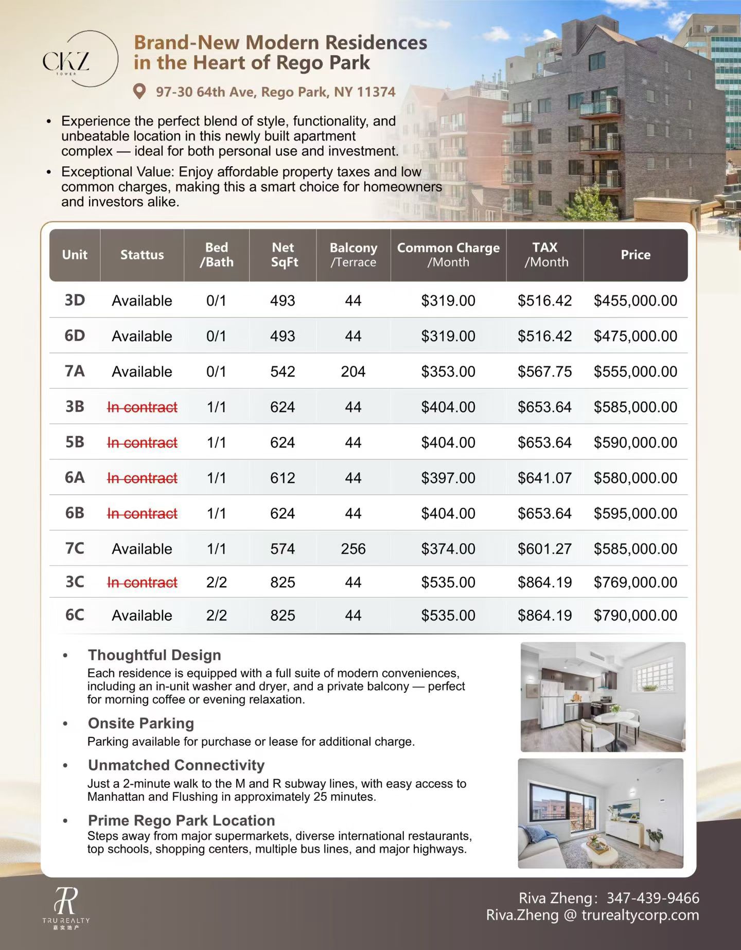 Rego Park CKZ Tower雷哥公园全新公寓仅剩最后一套1B1B和2B2B,售价$45.5万起,都市生活理想之选!公寓位于核心商圈中心,步行即可到达超市、Costco、Burlington及各类餐厅诊所,生活便利无忧。交通便捷,步行至M/R地铁仅2分钟,多条快速巴士直达曼哈顿,中城下城通勤轻松。周末开放看房,欢迎合作转发!无论自住还是投资,都是不可错过的优质房源。