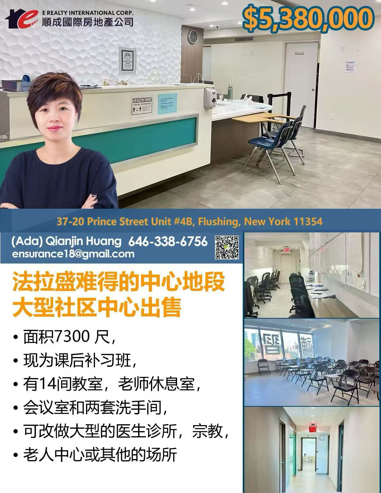 🎉🎉🎉法拉盛难得的中心地段大型社区中心出售 , 面积7300 尺,现为课后补习班,有14间教室,老师休息室,会议室和两套洗手间,可改做大型的医生诊所,宗教,老人中心或其他的场所,售488万, 每尺仅$730💰MLS 858017月租金可达$45000,回报率高达7% 減50萬488萬出、有興趣的快、有個 出租合同在進行 欢迎合作和转发Ada 6463386756 Steven 516-865-2466