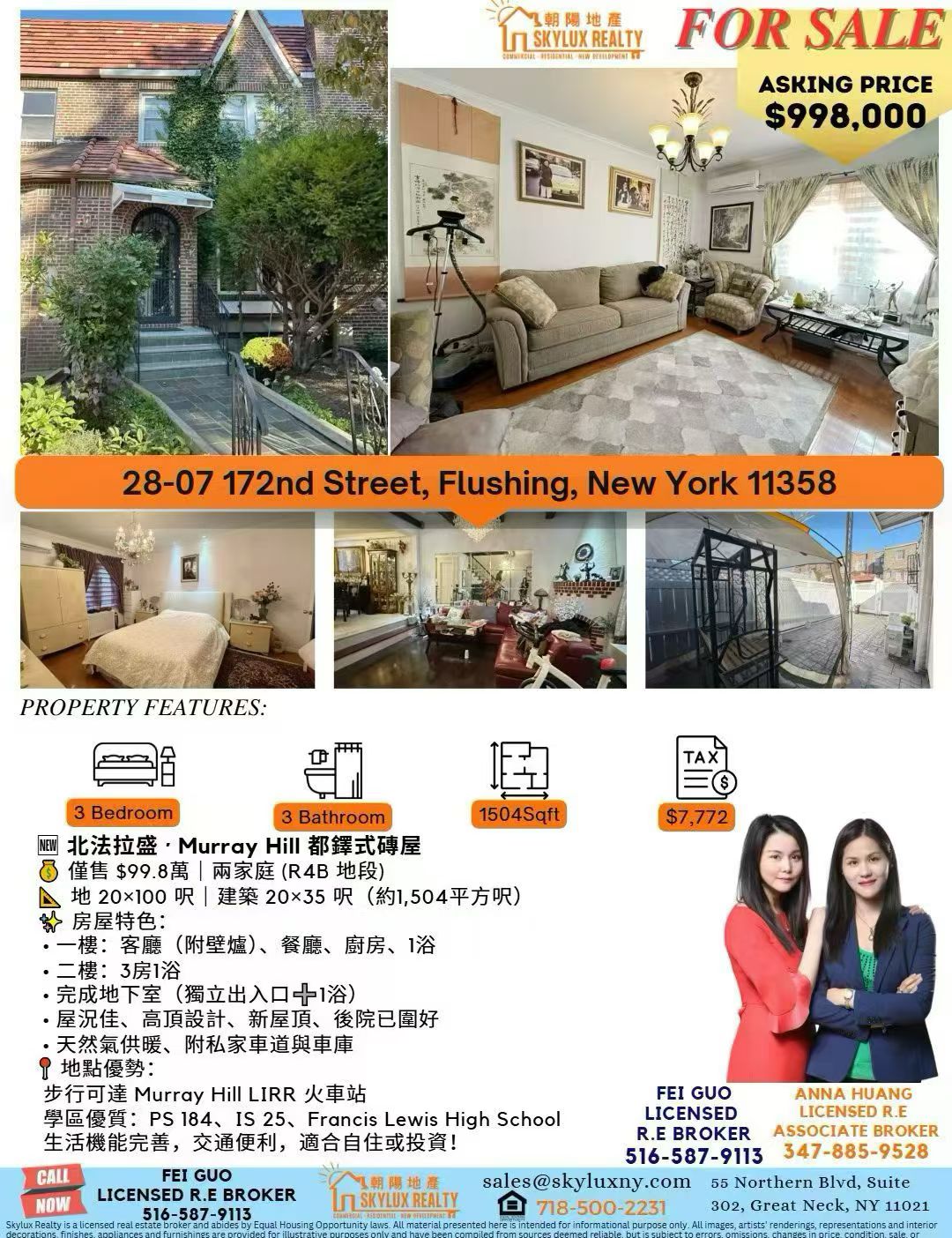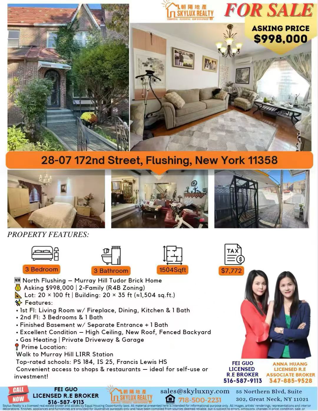 法拉盛房子出售 今天同一時間看 🆕地点 地点 位於北法拉盛Murray Hill Tudor 磚屋地 20x100 呎,建築面積20x35 呎,1,504 平方英尺,兩家庭地R4B。仅售99.8万