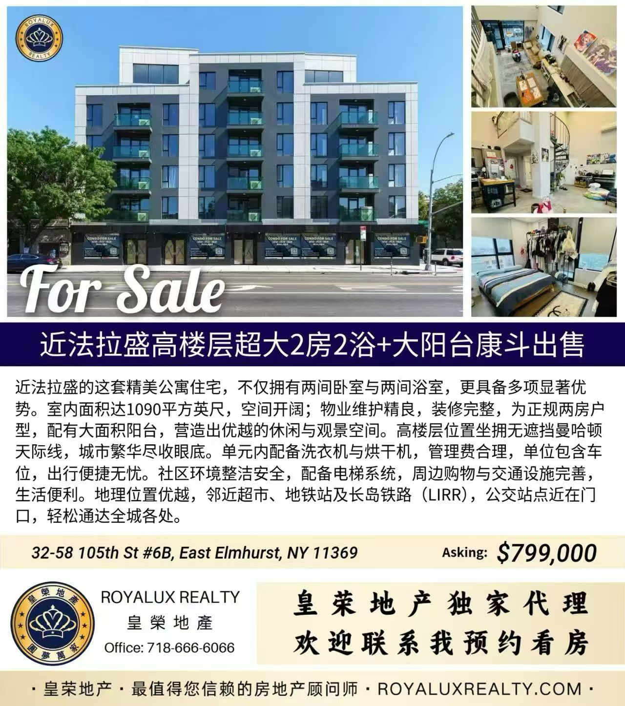 ⭐️近法拉盛高楼层超大2房2浴+大阳台+车位康斗出售 | 售价:79.9万
