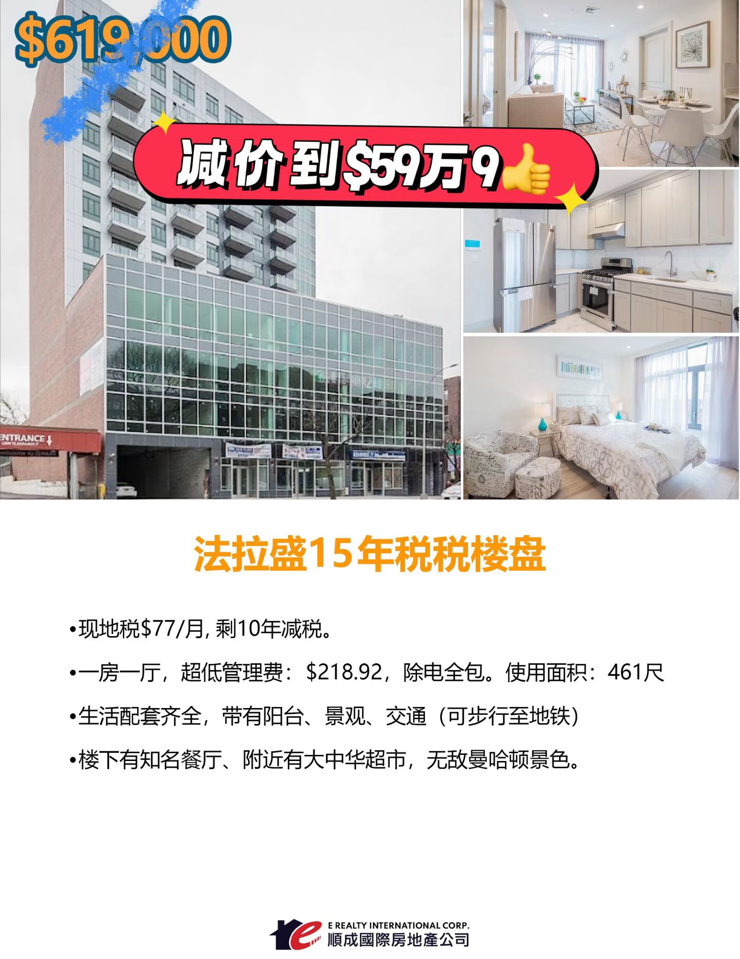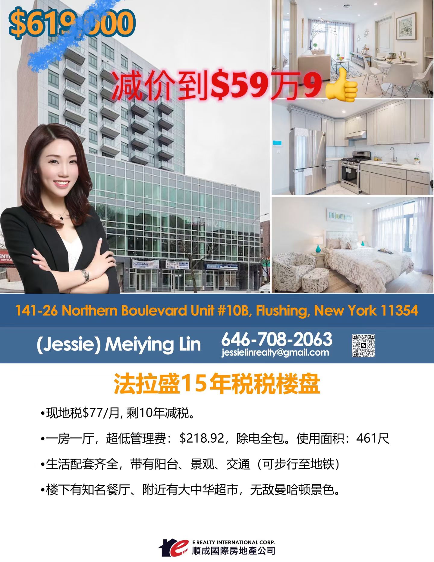 法拉盛康斗一房一厅出售🎈出售🎈法拉盛15 年税税楼盘,现地税$77/月👍剩10年减税。⭐️一房一厅,超低管理费: $218.92,除电全包。⭐️使用面积:461尺⭐️生活配套齐全,带有阳台、景观、交通(可步行至地铁)、楼下有知名餐厅、附近有大中华超市,无敌曼哈顿景色。机会难得✨售:$59万9联系Jessie看房☎️646-708-2063。欢迎合作与转发🙏