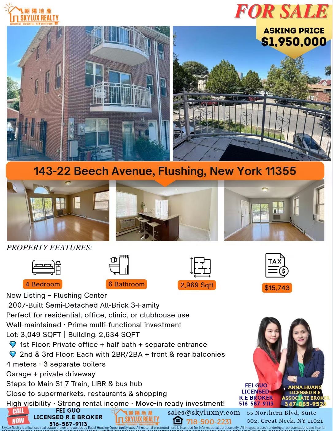 法拉盛房子出售 | 14322 Beech 三家庭住宅 | 半独立全砖自住首选,法拉盛全砖三家庭住宅出售|投资自住首选。法拉盛 14322 Beech 三家庭住宅出售,2007 建,全砖半独立房,三套住宅+独立办公空间,地下室可灵活利用,四个电表、三台煤气锅炉独立分开,车库+私人车位。邻近 Main Street 7 号地铁、LIRR 与公交枢纽,高能见度、出租回报佳,投资自住两相宜,售价 $1,950,000,机会难得!