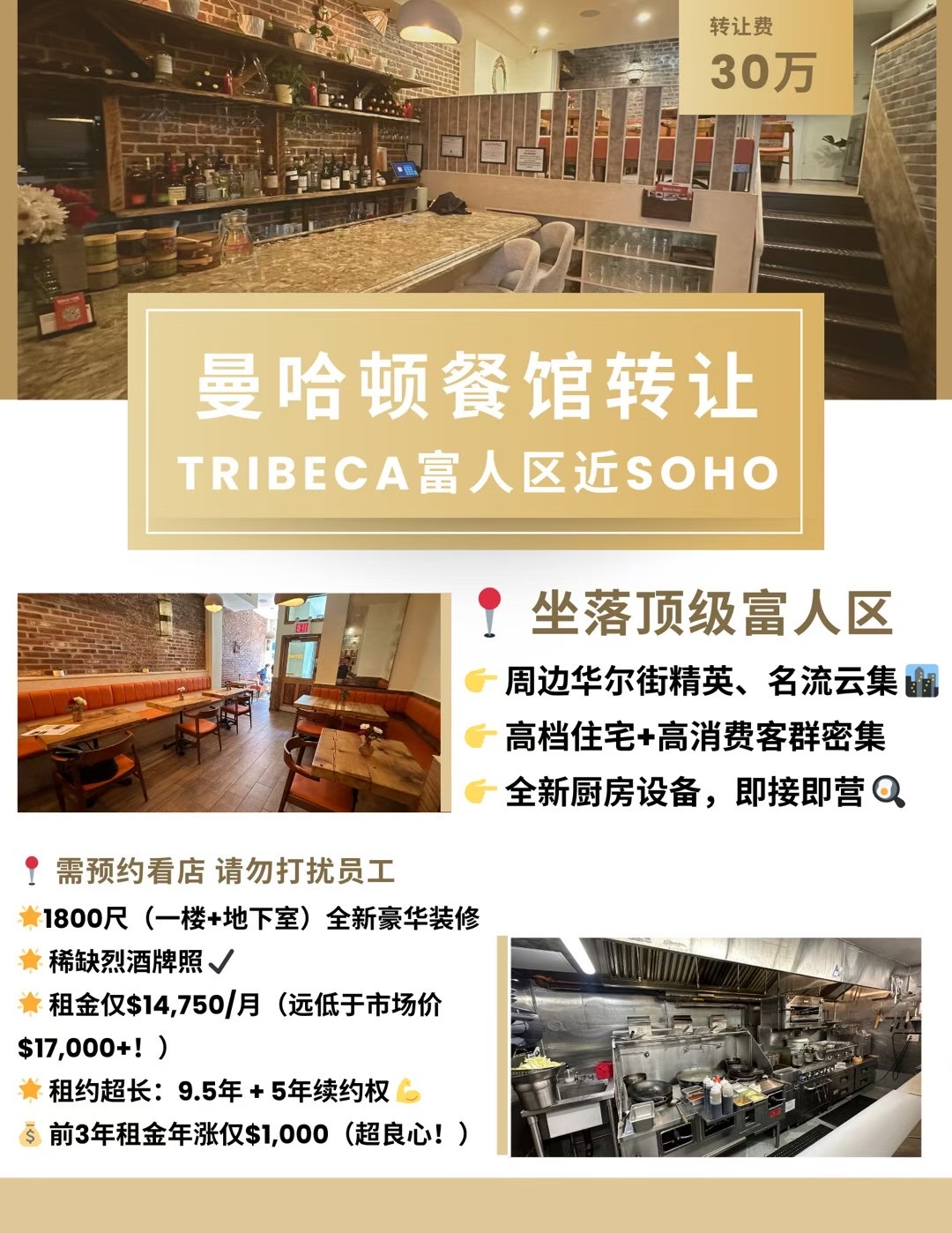 🆕【曼哈顿Tribeca黄金地段餐馆转让🔥】$30万