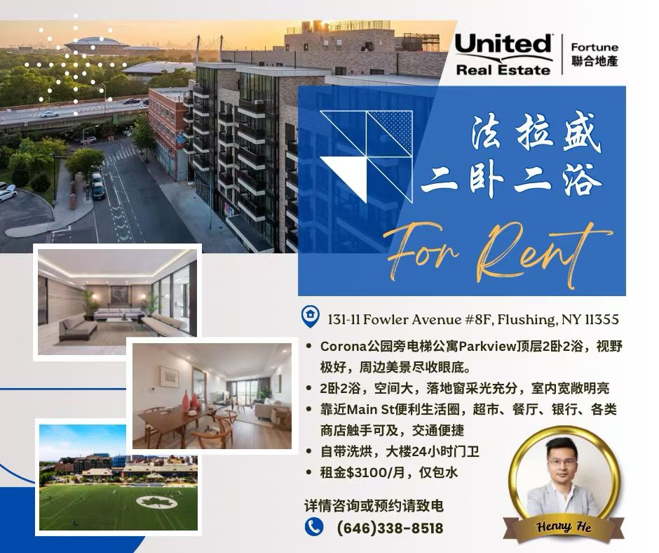 🏙 法拉盛Fowler Ave 电梯公寓 8F · 2卧2浴出租