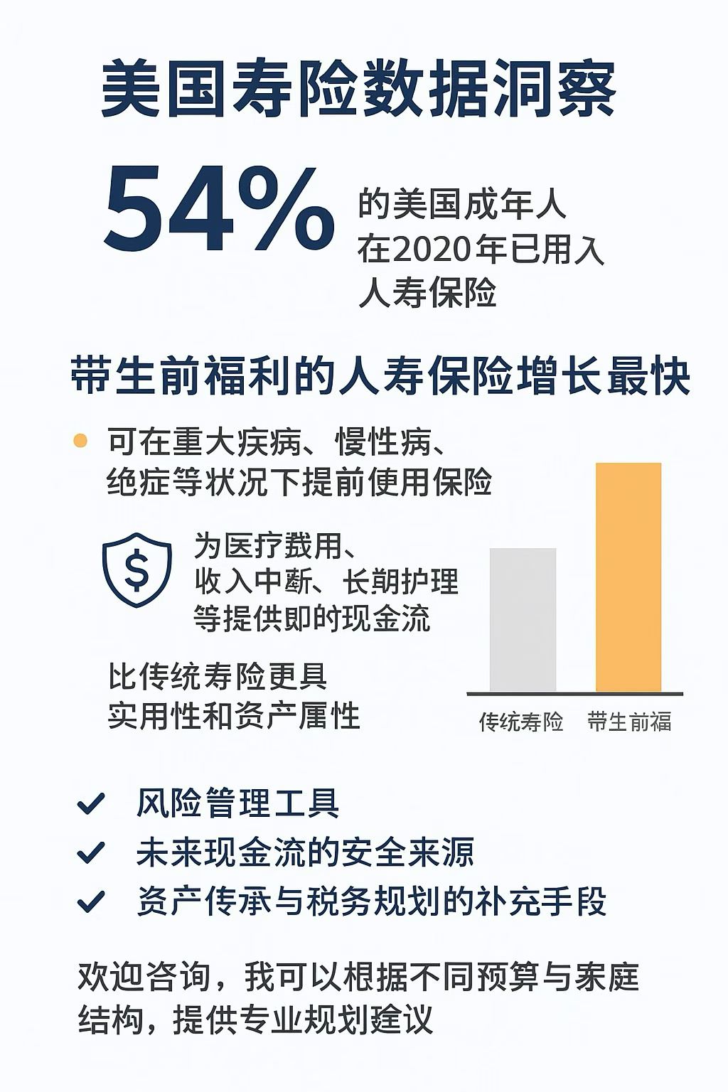 📊 美国寿险数据洞察🔹54% 的美国成年人在 2020 年已拥有人寿保险